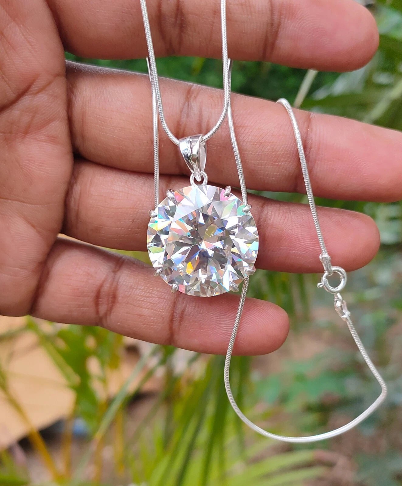 Welcome to Sunlight jewels Buy With Confidence from A Trusted Seller Every Diamond we sell is double tested and 100% guaranteed to be a Real Earth Mined Diamond! ********************************************************************************************************************************* ALL ITEMS WILL BE DELIVERED WITHOUT PAYING ANY TARIFFS, CUSTOM DUTIES ETC. BY YOU. GREAT BRILLIANCE & LATEST DESIGN! Diamond Color - White Shape of Diamond - Round Brilliant Cut Approx. Weight of Diamond - 100.00 Carat Approx. Size of Diamond - 40 mm Origin of Diamond - Brazil Species - Earth Mined Treatment - HPHT Cut - Excellent Clarity - VVs1 Metal - 925 Sterling Silver Finish - White Gold CERTIFICATE OF AUTHENTICITY PROVIDED This diamond pendent is handcrafted with utmost care. Would make an ideal gift for someone special. The diamond has excellent cut and luster. Comes in attractive packaging. Shipping : Shipping is by USPS/SPEEDPOST/DHL or similar shipping agencies to reach you in 9-12 business days after processing the order. Tracking is provided. For USPS the tracking will show up in transit after 7-9 days once it reaches US from India. Please note: Jewelry items can take up to 10-12business days to process to take care of ring sizing if any, polishing, finishing , packing and handling, certification, documentation etc. Shipping Charges include eBay fees on Shipping, packaging, certification costs, manpower costs, overheads, taxes etc. IN addition to actual courier/postal expenses which have increased substantially as a result of pandemic. We do not artificially increase the price of the products to include shipping charges but only charge what shipping actually costs us. Combined Shipping: Combined shipping discount is available up to 5 (Five)items in an order to be purchased within 5 days. You can continue to buy- Any additional items above 5 in quantity will be considered a new order. This is to avoid pilferage en-route as well as to ensure that you are happy with the merchandise. Once you have received their items you may buy additional items again. This limit may be revised for repeat and regular customers. Payment: Buyers are requested to pay within 3 (Three) days of purchases. eBay will automatically open unpaid item cases in case payment is not received within this period. The item will also be available for purchase to other buyers till such time that the payment is received. Customs and Taxes: Any customs duties, charges and local taxes are subject to local laws and vary from country to country and hence the payment of any eventual custom duties, charges, levies and taxes etc will be at the buyer's expense. We do not have any control on the same. Returns & Refunds: You can return the item within 14 days of receiving the parcel. - Please return in original packing. Buyers are required to check and ensure that the item/s are in good condition and as per item listing on eBay as no claims for returns and refunds will be entertained thereafter. The returned item should be unused and in original and undamaged condition. Buyer will be required to ensure that the item is sent by trackable shipper. Shipping charges are non-refundable. Refunds are made by PayPal and may take up to 5-7days after receiving back the product/s. Disputes: We aim to settle all disputes amicably. Please do not open any dispute on eBay for dis-satisfaction or for non-receipt or to return an item. We are available through ebay messages system and most messages are replied in a few hours. Personalized satisfaction is of utmost importance to us. Feedback : We always provide excellent feedback to our buyers and expect the same in return with 5-star ratings. In case of any dissatisfaction or any other reason please do contact us before leaving any neutral or negative feedback - we will strive our best to resolve all issues to your satisfaction. Metal : Silver is 925 Sterling Silver with Nickel Free Rhodium Plating. Please refrain from buying if you have allergic reaction to metals. We will not be responsible for any health problems in this regard. Legal Disclaimer : Refund or any claim liability for the buyer is only limited to the value of the item purchased. No additional claims will be entertained for any other reason whatsoever. Please note that since various labs may have different testing methods and the interpretation of all our Diamonds and Stones may differ from one lab to another as well as from one Gemologist, appraiser and Jeweler to another, we will be unable to accept another Lab Certificate or the judgement of any other third party including any Gemologist, appraiser, Lab, Jeweler etc. By consenting to buy our items it is understood that you have read, understood and agree to the terms and conditions as well as the FAQ for the Diamonds and Jewelry being sold buys. FAQ What are Color Diamonds? These are genuine Colored Diamonds found naturally mines mainly from Brazil. They are more porous than White Diamonds and are found in the upper layers of the ground relative to the White Diamonds that are mined deep. Some scientists are of the opinion that their origin maybe a Meteor that impacted earth Billions of years ago. What is their nature? Colored Diamonds are not found in the state as they are sold. They are made from earth mined rough rock found in mines of Brazil. The Rock color varies from Light Blue, Dark Blue, Champagne, Pink, Green etc. What is the treatment process? To bring out its true color it needs to be treated. The process is a natural one employing gentle heating a high-pressure environment (HPHT) which gradually brings out the true color of the Diamond. Are any artificial colors or chemicals added? There are no artificial colors or chemicals included in the process. They are not irradiated. Does it alter the composition? The process may or may not alter the composition. It remains a true Diamond nevertheless. Once our diamonds are heat-treated, it may move the molecules. This causes them to not 