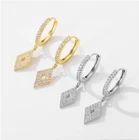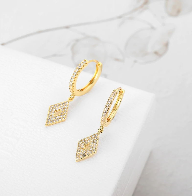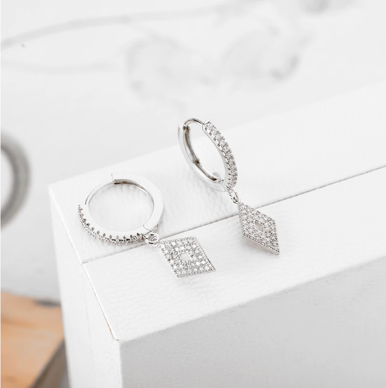 These beautiful edgy huggie hoops are perfect for stacking with similar style cartilage piercings. A rhombus shaped pendant charm is set pave mosaic style with clear cubic zirconia stones. The hoops themselves are also embellished with CZ stones. Available in silver or gold plated finishes. Please see last photo for measurements.