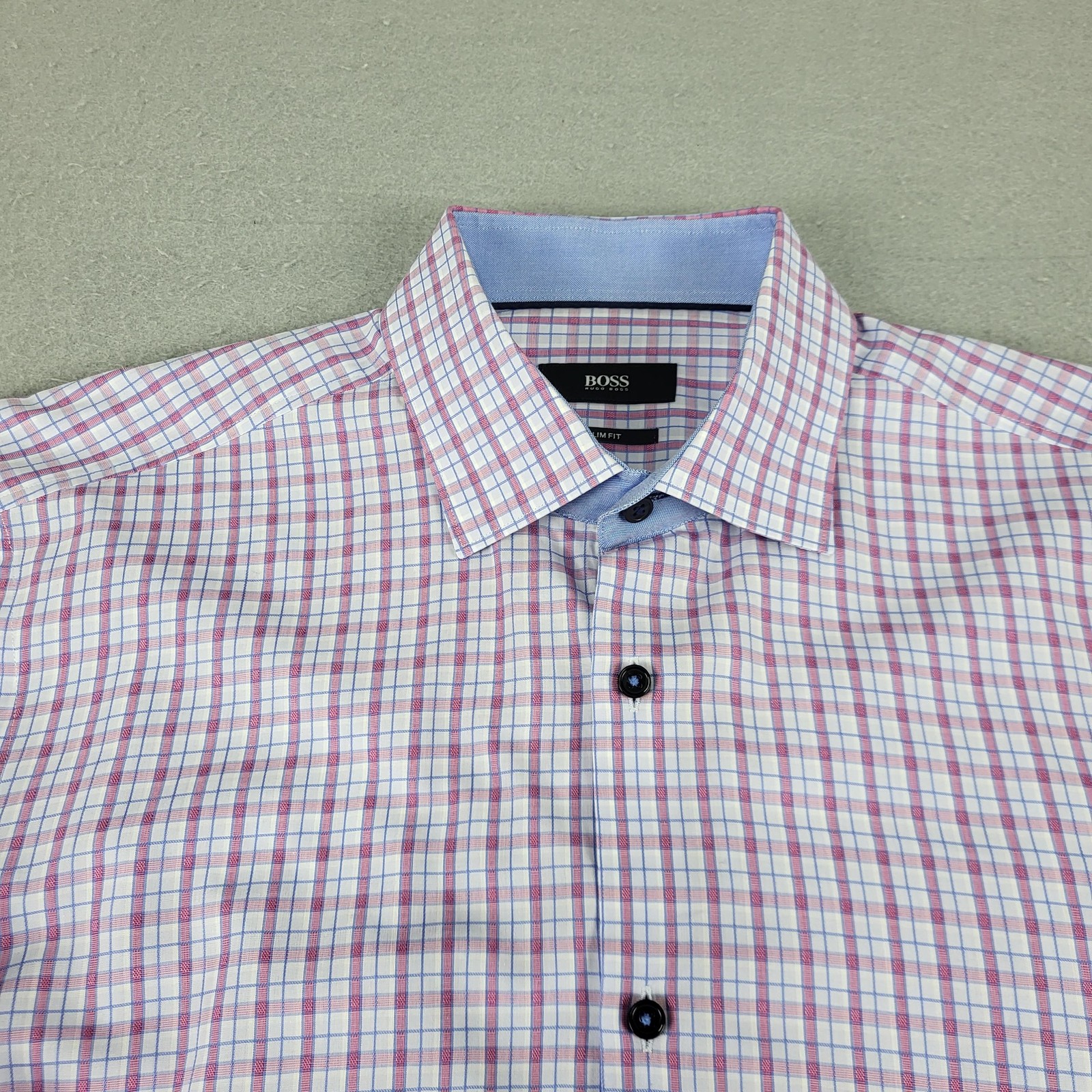 Brand: Hugo Boss (BOSS) Style: Juri long-sleeve button front woven dress shirt in a pink and blue check pattern with contrast light blue inner collar and cuffs. Fit: Slim Fit Gender: Mens Size on tag: 39 / US 15.5 neck Material: 100% cotton including trim (per tag). Color: White base with pink and blue check pattern, light blue contrast details. Made in Vietnam. Details: Spread collar, button front closure, adjustable barrel cuffs with contrast lining, curved hem, includes two spare buttons on original care tag. UPC: 742228189425 Additional codes on tag: 6039244, Z007186750, 50296081, 1017214 01 673, 20074900550909 00010 00000, RN 73616, CA 23115. Disclaimer: Different sources of lighting can change your perspective on the color of the clothing Disclaimer: All clothing is measured in a resting position lying flat. All items have been cleaned per eBay standards & policies. We ship items daily via USPS Ground Advantage or Priority Mail with a tracking number for confirmation, so expect a quick delivery. We also offer free 30-day returns!! Please feel free to reach out anytime with any questions you may have. Thank you for shopping at Curiosity Corner RVA!!! Follow my store for greater discounts seller:kevredfor_0