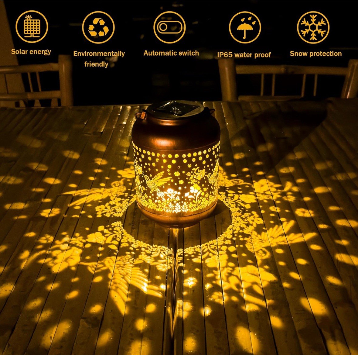 Product details Top highlights Brand anytalk Color Hummingbirds Material Iron Product Dimensions 5.2"L x 5.2"W x 6.77"H Number of Batteries 1 AA batteries required. (included) Manufacturer Deco&Dot Exquisite Patterns: These hanging solar lights are designed with vintage cutouts that cast beautiful patterns on the wall or lawn, creating a warm and welcoming atmosphere. When you come home and sit next to the outdoor lantern, it will relieve the fatigue of your day and help you relax. IP65 Waterproof: The outdoor solar light is made of strong metal and high-strength ABS material with anti-rust treatment, ensuring durability. With its IP65 waterproof design, it can resist all kinds of weather throughout the year. You don't need to worry about rain or snow, as it can provide good lighting even on rainy or cloudy days. Automatic Switch: These outdoor solar lanterns absorb solar energy during the day and automatically turn on at night for 8-10 hours after being fully charged. They save on energy costs by eliminating the need for wiring or external power supplies. All you have to do is flip the switch to "ON." HANGING OR STANDING: You can hang the outdoor solar lanterns on your porch, tree, pergola, or place them on a tabletop, lawn, or ledge. They present vivid and beautiful patterns on tables or grounds, making your patio stand out. They are great for gardens, patios, backyards, pathways, walkways, yards, balconies, and home decor. GARDENING GIFT: These solar outdoor lanterns are suitable for every scene, whether placed on the ground or hung on a tree. They are a great choice for decorating gardens, porches, yards, and patios. It's a creative gift idea for family, moms, grandmas, and friends during festivals, Christmas, parties, and also a perfect gift for gardening lovers.