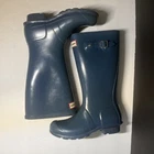 These Hunter Boots Youth Girls Size 3 Blue Tall Rubber Rain Boots are perfect for outdoor activities in all seasons. With a comfortable and waterproof design, these boots feature a round toe, low heel, and buckle closure for easy wear. Made with a blended fabric lining and rubber outsole, these boots are durable and ideal for walking or school. The classic blue color and logo accents add a touch of style to these practical and versatile rain boots.