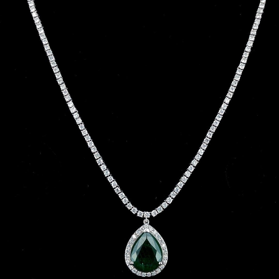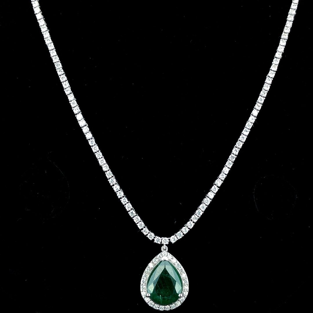 One Platinum 950& 18K WHITE Gold Necklace weighing in total 25.39 g., containing One (1) Natural Emerald Estimated Weight : 5.70 Carats and Two Hundred Fifteen (215) Natural Diamonds Total Estimated Weight : 5.44 Carats IGI Report No : 62J5425425 , Description of Article One Platinum & Gold Necklace One (1) Pear Mixed Cut Natural Emerald Species : Natural Beryl Measurements Estimated Weight Color/Transparency Characteristics Comments : 14.19 x 10.26 x 6.78 mm : 5.70 Carats : Green, Transparent : Natural inclusion(s) pattern : Indications of moderate clarity enhancement. Natural emeralds are commonly enhanced as part of their normal fashioning process. DIAMONDS Two Hundred Fifteen (215) Round Brilliant Total Estimated Weight : 5.44 Carats Color Clarity : G - H : VS