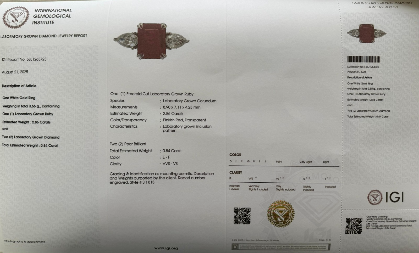 Exclusive 14k White Gold Ring Ring size - 6.5 US *ring size can be adjust for free Total Carat Weight - 3.7 Main Stone: Ruby Shape: Emerald carat Weight of main stone: 2.86 Surrounding Stone - Diamond Diamond Weight: 0.84 (2 Pcs) We ship everything secured and discreet by DHL Total Ring Weight: 3.55 gram 14k White Gold Safe & secure What are lab-grown Diamonds? Lab-grown diamonds are diamonds produced by scientists using technology that recreates the conditions under which diamonds form deep in the earth. A lab-grown diamond is chemically, physically, and optically identical to diamonds that formed naturally the only factor that makes them different from a natural diamond is that they originate from a lab. For that reason, lab-grown diamonds cannot be considered 'rare' or 'unique' and as such they represent a more affordable option when compared to natural diamonds and are valued at a considerable lower price per carat.