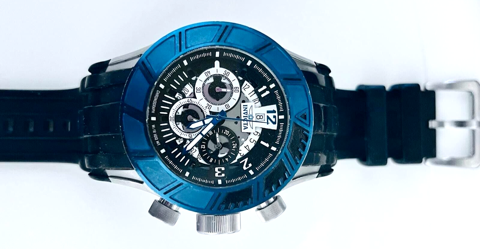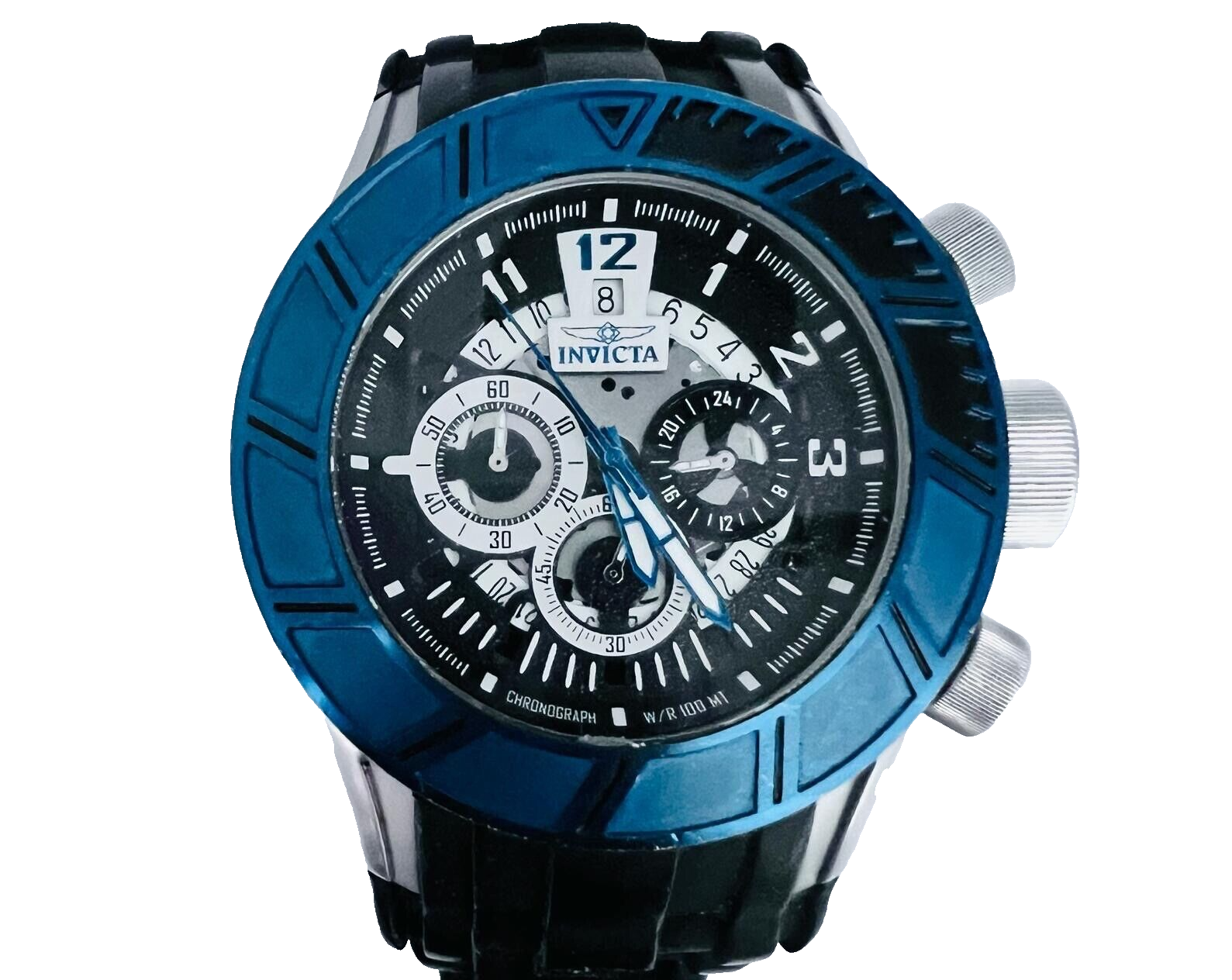 Preowned In great condition! INVICTA ProDiver Chronograph Men’s Watch in Blue Black and White colors Water resistant 100 Mt - Model 14026 Elevate your style with this Invicta Pro Diver Chronograph wristwatch. With a case size of 50mm and a water resistance of 100m, this watch is perfect for sports enthusiasts. The stainless steel case is available in silver, blue, and black colors, and the polyurethane band in black. Featuring a Japan quartz movement, screwback case, and chronograph features, this watch is the perfect combination of functionality and style. The 12-hour dial indices, white or black dial color options, and silver or black bezel color options make this watch a versatile accessory for any outfit. The Invicta Pro Diver reference number 14026 is a timepiece that you should not miss. Refer to chart included in pictures for exacts Features and Specs.