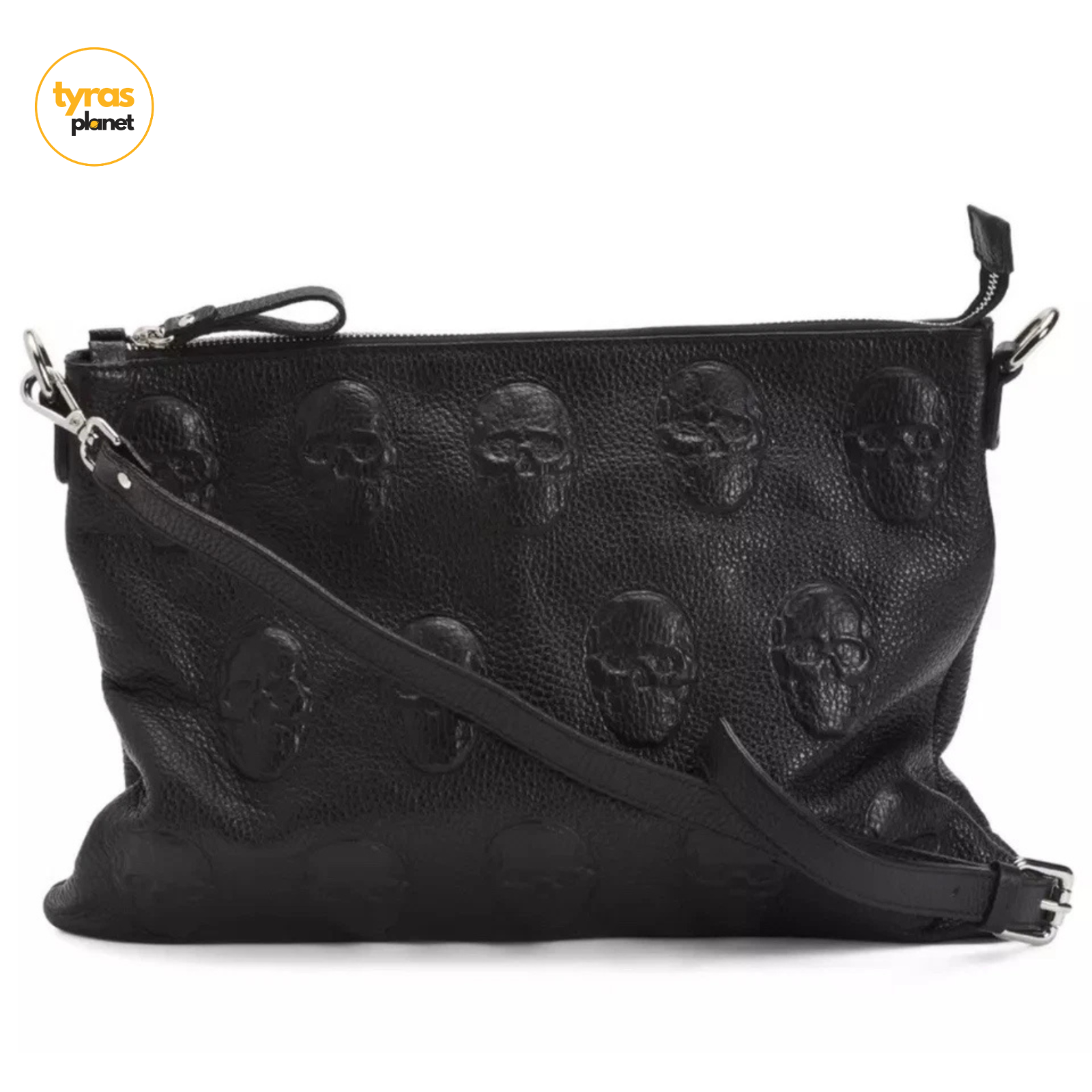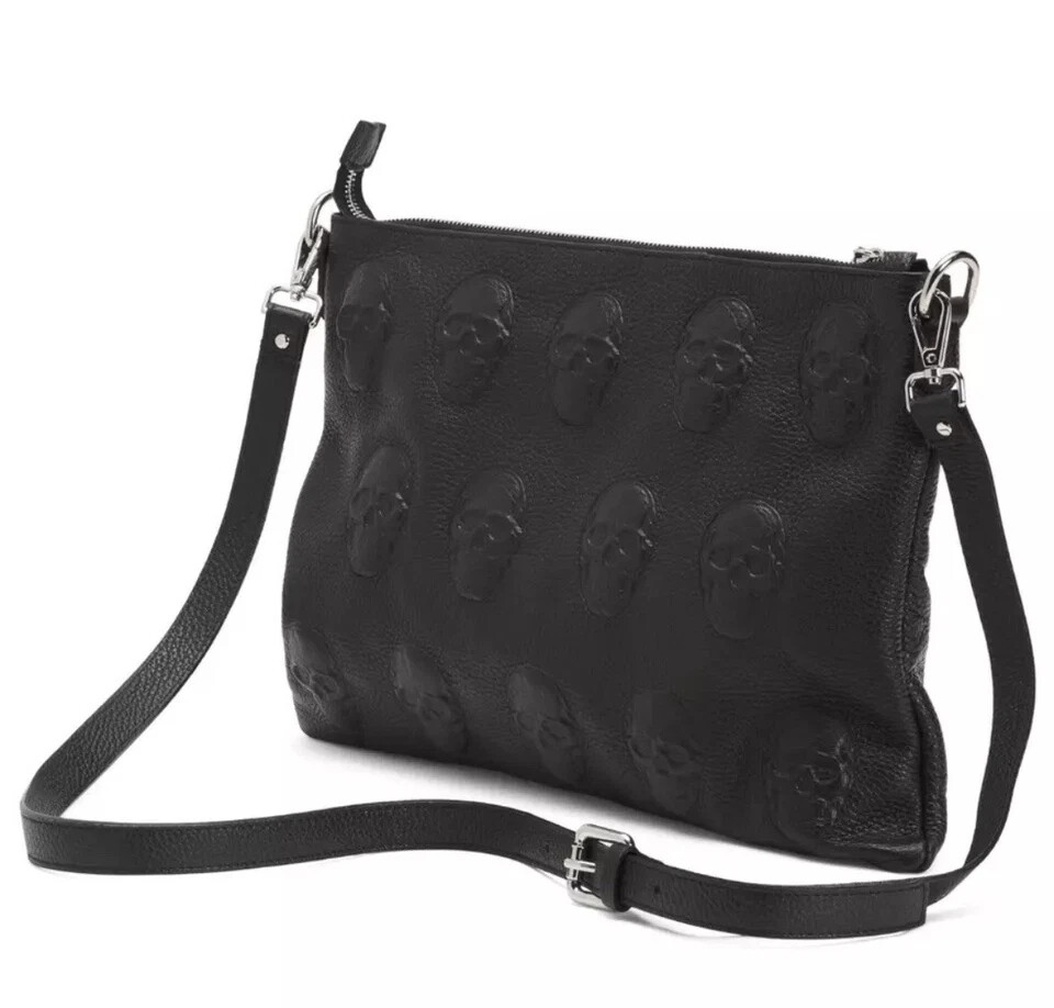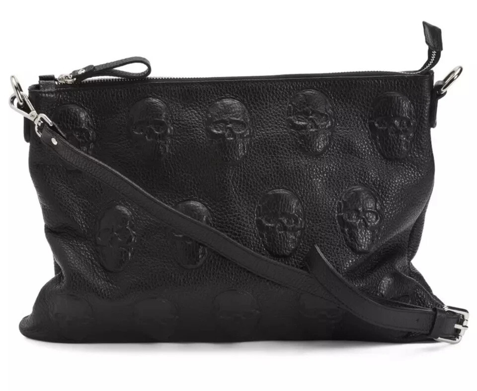 IO Pelle Leather Skull Crossbody IO PELLE Italia Pebbled finish Very soft Italian leather 3D skull detail Adjustable shoulder strap 14” wide x 10” high Zip closure, 1 interior zip pocket, 2 interior slip pockets Brand new with tags Dust bag included