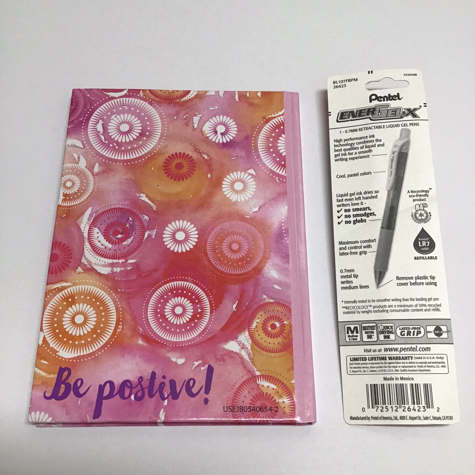 NEW - Journal Notebook Diary with Gel Pen SET. Fun design, 5” x 7” Journal is hardback with 60 Ruled Pages. Wipeable. Pentel pen is an EnerGel-X liquid gel pen with quick dry/no smear ink. Medium 0.7mm. Great set to keep in your purse, car or bedside table to jot down a quick thought. Set is sold as shown. Theme: Be Positive Pen: Violet Ink