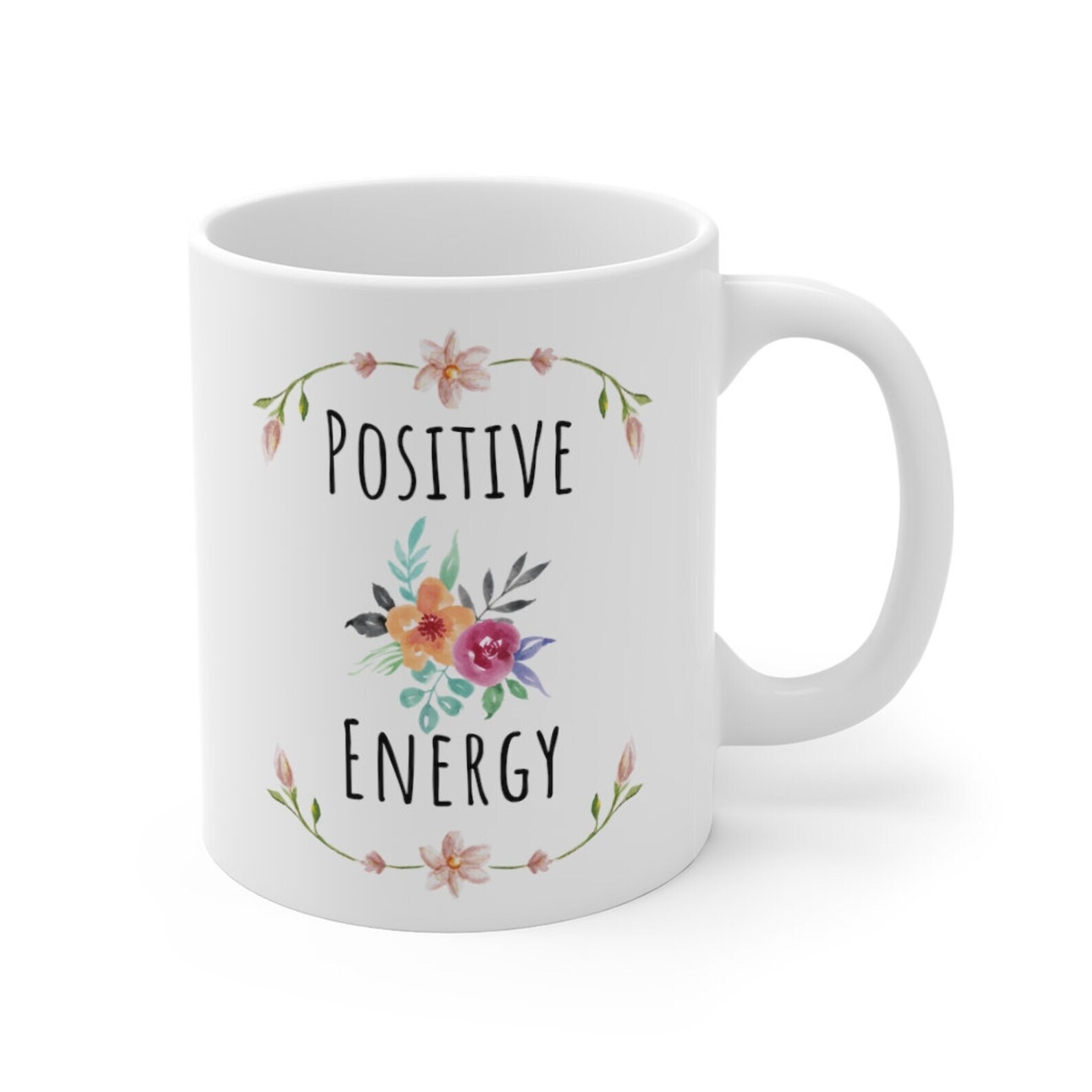 Positive Energy Gift Mug Motivating Uplifting Gifts Mindful Gift Positive Gifts Watercolor Flowers Mug Christmas Gift Mugs Product Details.. This high quality 11oz. ceramic white mug has a premium hard coat that provides crisp and vibrant color reproduction sure to last for years. Perfect for all hot & cold beverages. The highest quality printing possible is used. It will never fade no matter how many times you wash it. Material: 100% Ceramic. Print both sides. Dishwasher and Microwave Safe. High Gloss + Premium White Finish. Printed in the U.S.A. Personalized & Custom. We support personalized and custom mug to add custom, when placing an order, you can add notes to the "order note" in shipping address section. Also you can contact us directly via message. Shipping Info. Ready to ship in 1 to 2 business days, All products are made-to-order and proudly printed in the United States. Shipped by USPS and DHL, You will receive your order in 5-7 days. Replace & Refund. All products are defective during shipping broken, chipped will be replaced free of charge. You are not satisfied with the product, we will refund 100% money to you. If any other issues arise, please do not hesitate to message, we would be more than happy to assist you.