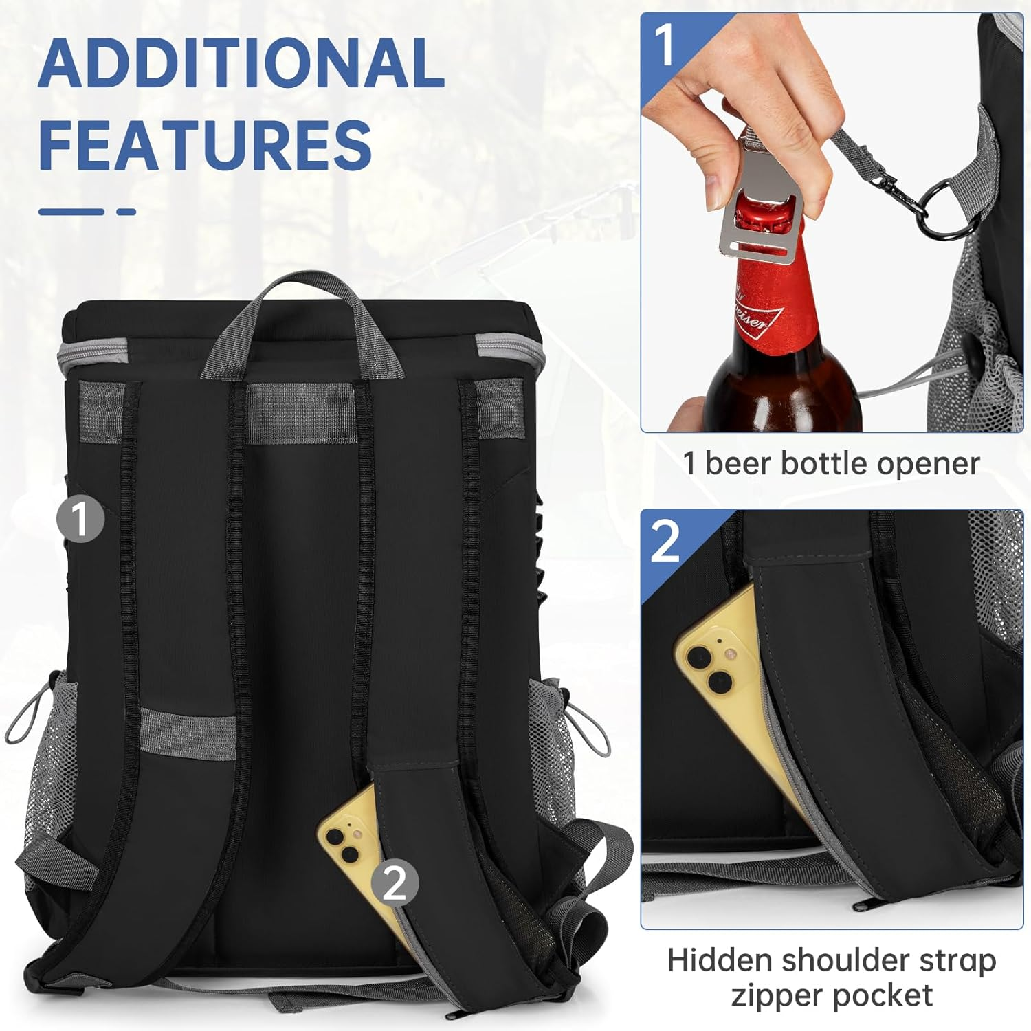 This cooler backpack is a game-changer for outdoor adventures! Keeps drinks icy cold for hours, and the leakproof design is perfect for picnics or beach trips. Super lightweight yet spacious enough for 30 cans, plus it’s comfy to carry. Love the durable material and handy pockets—great for camping, hiking, or even work lunches. Highly recommend!