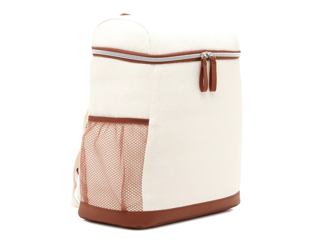 This stylish backpack is perfect for keeping your food and drinks cool on the go. The cream/brown color combination and faux leather trim add a touch of sophistication to its lightweight design. The backpack cooler features side mesh pockets and is collapsible for easy storage. Made from durable cotton canvas and faux leather, this backpack is suitable for a range of activities, including the beach, work, gym, sports, traveling, camping, and hiking. With a height of 13.75 inches, depth of 6.25 inches, and width of 10.5 inches, it's the perfect size for all your essentials. Get ready for your next adventure with this backpack insulated cooler from DSW, retailing at $49.99.