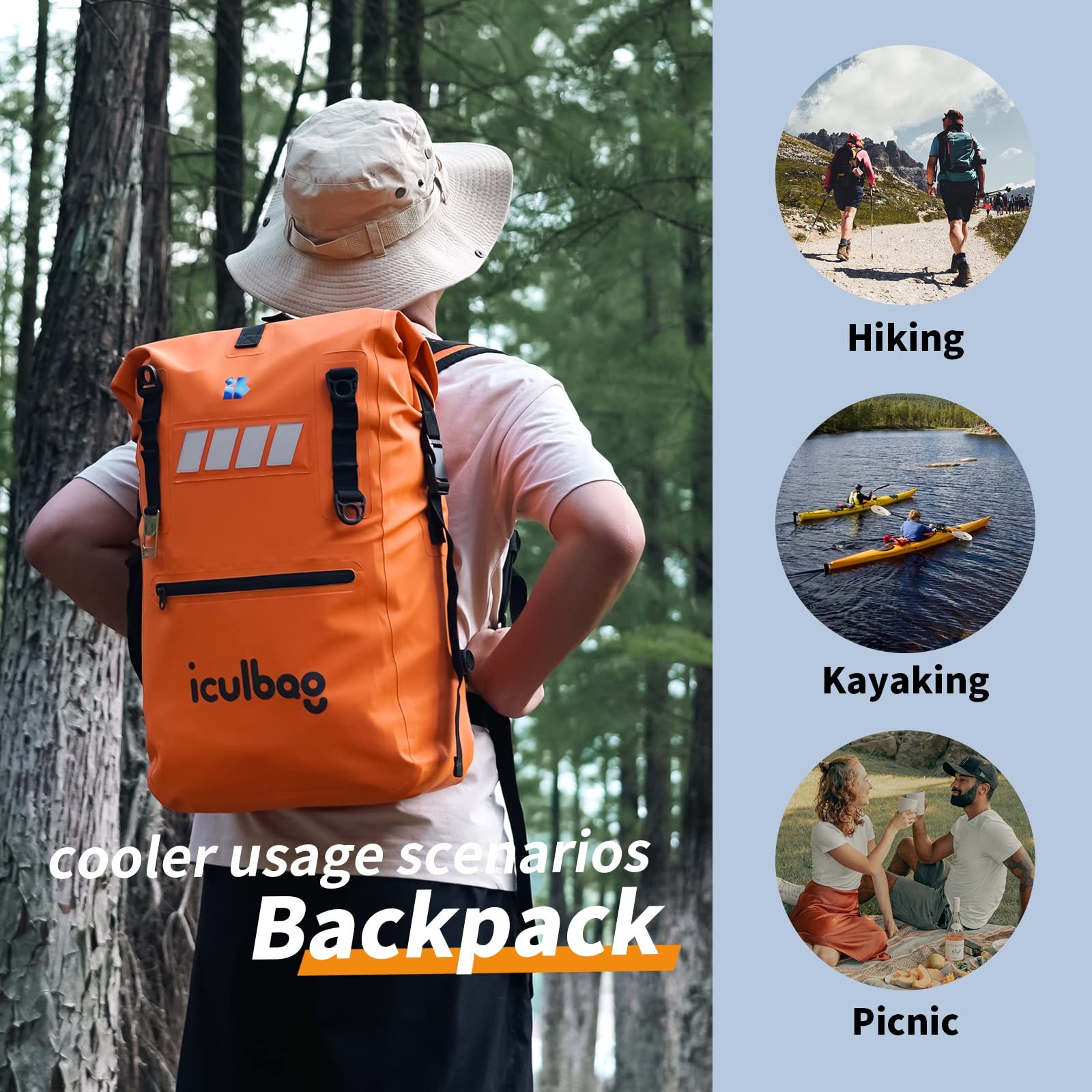 The Backpack Cooler is a must-have for summer, whether you're hiking, camping, or picnicking. Fill the backpack cooler with beer, lunch, soda, fruit, and ice. The cooler bag is well-insulated to keep the ice cold for up to 12 hours. This backpack cooler is waterproof and features a front pocket with a white reflective stripe on top, which must be removed to properly use the cooler. The reflective stripe is flanked by D-ring hooks, perfect for hanging a variety of small items, including a beer opener for picnics. There’s also a side pocket for storing drinks. The interior of the backpack is waterproof, and thanks to the roll-top closure design, you won’t have to worry about leaks once the ice melts. We hope the Refrigerated Backpack earns your favor, and your satisfaction is the greatest encouragement to us! Backpack Cooler Insulation Material: backpack coolers insulated leak proof, consists of 3 layers of material, the outer layer is made of 500 DPVC fabric, which is waterproof on fierce rainy days. The center is stuffed with 10mm PU cotton and the bottom is stuffed with 2 layers. Compared with the conventional cooler backpack, an iculbal cooler bag can keep beer and cola cold for 12-48 hours, with the benefits of cooler bag insulated, waterproof and leak-proof. Cooler Bag WELL DESIGNED: This backpack cooler holds 36 cans of Coke for beer and food storage. The cooler backpack insulated waterpfoof,has a front zippered pocket for storing small items. There is a side pocket for you to store your beverages. The cooler backpack is equipped with a well-designed beer opener and multiple D-rings that can also be used to hang small outdoor items. To ensure safe travel at night, the protective film on the white reflective strip needs to be removed for use. Insulated Cooler Backpack How to Seal:Open the cooler backpack bag opening, fill the ice bag with beer drink food, then roll the opening of the insulated backpack down 2 or 3 times until there is no space inside the backpack. Use the side clips to fasten the sides to prevent the air in the collapsible cooler bag from leaking out. Then clip the clips on the front of the cooler bag to better seal the backpack so you can put the cooler backpack on and lace up the chest buckle for your trip. Multifunctional and Pleasant to Serve:Insulated cooler bags can be folded, easily placed in the trunk of the car for travel. Insulated backpack cooler is suitable for camping, kayaking, picnic, travel, party, beach, work lunch cooler bag, large capacity cooler backpack can accommodate 3-4 people lunch. Backpack Cooler System Features: cooler backpack back 360 degrees breathable, adjustable waist belt, sternum buckle and shoulder straps make cool backpack pads fit your body, distribute the weight of your back, reduce shoulder pressure and protect your spine from slipping. The mesh cotton padded shoulder straps dry quickly even when wet, so you don't have to worry about the weather.