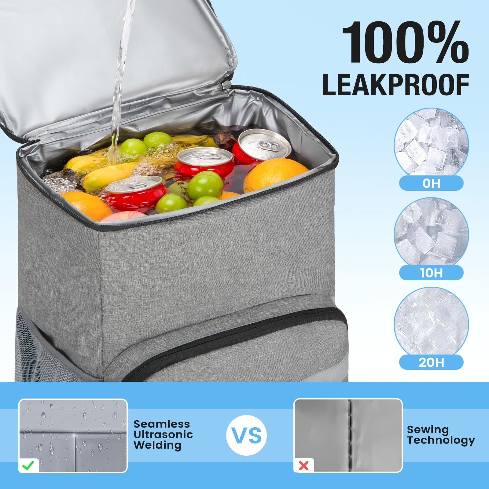 Elevate your outdoor adventures with our premium Backpack Cooler. Designed for ultimate convenience and efficiency, this cooler combines the portability of a backpack with the high-performance insulation of a cooler, making it perfect for any occasion. Key Features: Superior Insulation: Keeps food and beverages cold for up to 24 hours. Spacious Storage: Large capacity with multiple compartments for organized packing. Durable Design: Made with high-quality, waterproof materials to withstand rugged use. Comfortable Carry: Ergonomic shoulder straps and back padding for easy, comfortable transport. Versatile Use: Ideal for camping, hiking, beach outings, picnics, sports events, fishing trips, road trips, and everyday use. Perfect For: Camping Trips: Keep your food fresh and your drinks cold. Hiking Expeditions: Stay energized with chilled refreshments. Beach Outings: Enjoy icy beverages under the sun. Picnics in the Park: Maintain the perfect temperature for your snacks. Sporting Events: Refresh yourself with cold drinks on the go. Fishing Trips: Ensure your bait and catch stay cool. Road Trips: Store snacks and drinks for long journeys. Daily Use: Pack your lunch and beverages for work or school. Experience the ultimate convenience and versatility with our Backpack Cooler, your go-to companion for all your cooling needs on the move. 【Spacious Capacity】: The backpack cooler leakproof measures 15.75''x13.19''x7.87"( H x L x W) and can hold up to 54 cans (36L), roomy enough to pack meals, beers, tall beverages, snacks and other necessities. Perfect insulated cooler backpack for lunch, work, hiking, camping, barbecues, beach, road trip, outdoors etc. 【Longer Cooling Time -20h】: 's backpack cooler is made of high-quality PEVA material and thick insulating foam. Our waterproof backpack with cooler compartment keeps your food and drinks at the desired temperature (hot or cold) to 8-20hrs. You can drink cold beer, eat fresh snacks or fruit with friends or family anytime. 【Leakproof and Long-lasting】: The hard liner and waterproof zippers make our backpack coolers insulated leak proof, ensuring your drinks and food are safely stored. Sturdy material and Sturdy Stitching to ensure these cooler bags insulated for travel will have a long service life. The backpack coolers insulated leak proof best perfect for kayaking, fishing, and golf. 【Multiple Compartments】: 1 main large soft coolers insulated leak proof storage compartment for drinks or food, 2 pockets in front for your dry items, and 2 plus large mesh side pockets which are perfect space for tall beverages or water bottles. coleman backpack cooler ideal as a picnic backpack or lunch backpack for men. Perfect awesomecooler bags insulated! 【Versatile】: Our soft sided cooler is ideal for any occasion. Besides being used as an excellent cooler bag, using it as a beer cooler, boat cooler, ice cooler, dry ice chest, backpack lunch bag for men and women, hiking backpack, camping backpack, drink cooler, and beach cooler bag. In addition, Ergonomic and padded shoulder straps greatly relieve shoulder pressure, making the journey more comfortable.