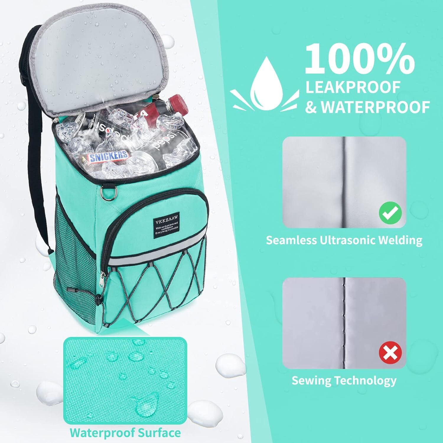Waterproof Oxford Cloth Imported Insulation and Anti-leakage waterproof backpack: the inner thickened and anti-leakage PEVA liner works together to prevent leakage and keep food cold for 16-20 hours with ice packs,keep food warm with this backpack. Lightweight and Cute Cooler Lunch Backpack: The cooler backpack weighs only 1.2 pounds, The deep main compartment can hold 26 cans, enough for meals, beer, snacks and even large drinks. The perfect insulated cooler backpack for day trips, camping, hiking, picnics, and beaches. Durable & Comfortable Structure: Double adjustable padded shoulder straps and thick back pads provide maximum comfort and support. Additional top padded handle with beer opener on the strap for easy carrying and clean. Sturdy and Durable Materials: Made of high-quality Oxford cloth, wear-resistant; high-quality zipper, sturdy and easy to pull. Multiple Pockets: 1 main spacious cold storage compartment, 2 side mesh pockets, 1 front zippered pocket for tableware storage. Enough to store food/beverage/fruit/beer, mobile phone, keys, tissues, bottled water, etc.
