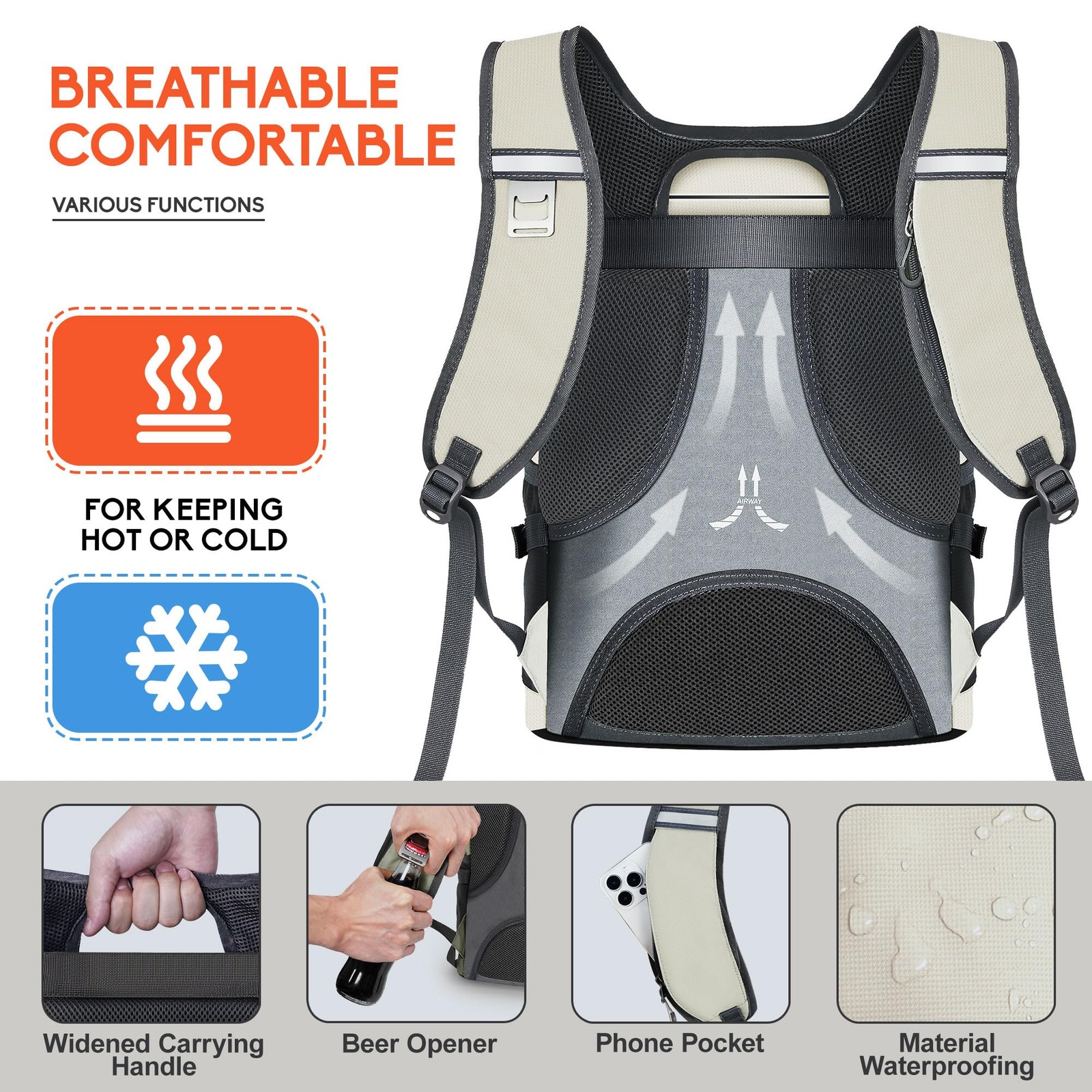 Nevo Rhino Insulated Cooler Backpack Waterproof & Leak-Proof 36 Cans Product Features: Leak-proof, waterproof and Durable: The insulated cooler backpack is made of 5 layer insulation materials. The TPU safety material is more durable, leakproof and waterproof. It is environmental protection materials and no odor inside. Keep Your Food Fresh, Cool, or Warm: Keep your foods, snacks and drinks cool for 18 hours temperature below 15℃(with Freeze Packs). Large Capacity with Multi Pockets: Insulated backpack for women and men has one beer opener, reflective stripe, phone pocket, one main storage pocket, one front zip pocket, two side mesh pockets and top storage pocket. Ventilate Exterior Material: This lunch cooler backpack use ventilate mesh material on the back to avoid your clothes getting wet by the condensation. Easy to Clean: Wipe down the interior liner after every use made to resist dirt, or food residues. Insulation System: High-density insulation thickened 5 layer nylon material with internal advanced TPU seal blocks UV light to keeping it cold/hot/fresh for up to 20 hours. Perfect soft cooler backpack for camping, traveling, hiking, beach picnics, self-driving, travel and other outdoor activities Waterproof & Leak proof: The materials inside and outside of our insulated backpack are waterproof. The cooler back pack liner adopts high-tech seamless hot pressing process for leak-proof. This means you can confidently fill the cooler bag with ice, beer cans or soda cans. It's the perfect lunch backpack for men women Lightweight & Large Capacity: 13 x 7.5 x 17"( L x W x H) Weight: 1.85 lbs NEVO RHINO cooler backpack can holds up 36 cans(330ml) which have enough space to meet your necessities Multiple Compartments & Pockets: NEVO RHINO backpack coolers insulated leak proof has 1 large main storage compartment, 1 top storage pocket, 2 front zipper pockets, 2 side mesh pockets , 1 front elastic rope net, 1 beer opener and 1 phone pocket on the strap Service: Please contact us if you have any problems. We will reply within 24h. (We provide replacement services for quality problems within 1 year and lifetime customer service.)