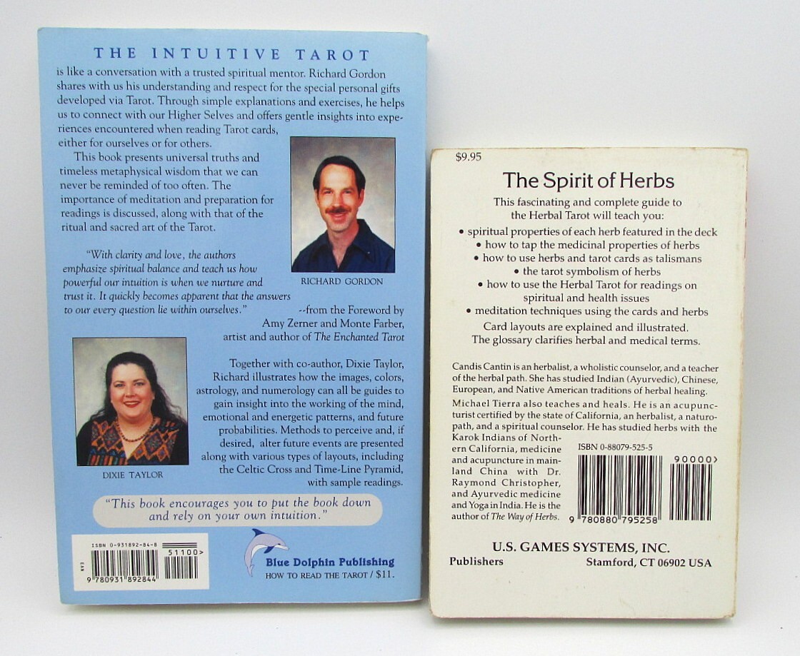 2 book set: The Intuitive Tarot: A Metaphysical Approach to Reading the Tarot Cards by Richard Gordon (1994) & The Spirit of Herbs: A Guide to the Herbal Tarot by Michael Tierra (1993). Both are softcovers and contain illustrations. Some edge wear and a few creases and spots. Former owner's name inside cover of Herbs book. Text clean and unmarked. tarot, tarot cards, tarot reading, occult, Major Arcana, Minor Arcana, divination, fortunetelling, metaphysical, intuitive, psychology, herbal, plants, healing plants, Michael Tierra, tarot book, Richard Gordon, New Age, symbolism, meditation, Native American
