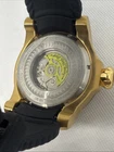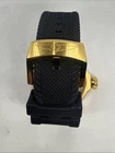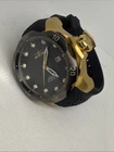 This is a men's wristwatch made by Invicta, model name is Sea Dragon 19316. It has a black and gold colored stainless steel case with a two-piece strap in black silicone. The watch features a black dial with round indexes and a 12-hour dial. It has a mechanical (automatic) movement and is water-resistant up to 100 meters (10 ATM). The watch has a round shape and is designed for a maximum wrist size of 8.5 inches. It was manufactured between 2010-2019 and does not come with papers or its original box/packaging.