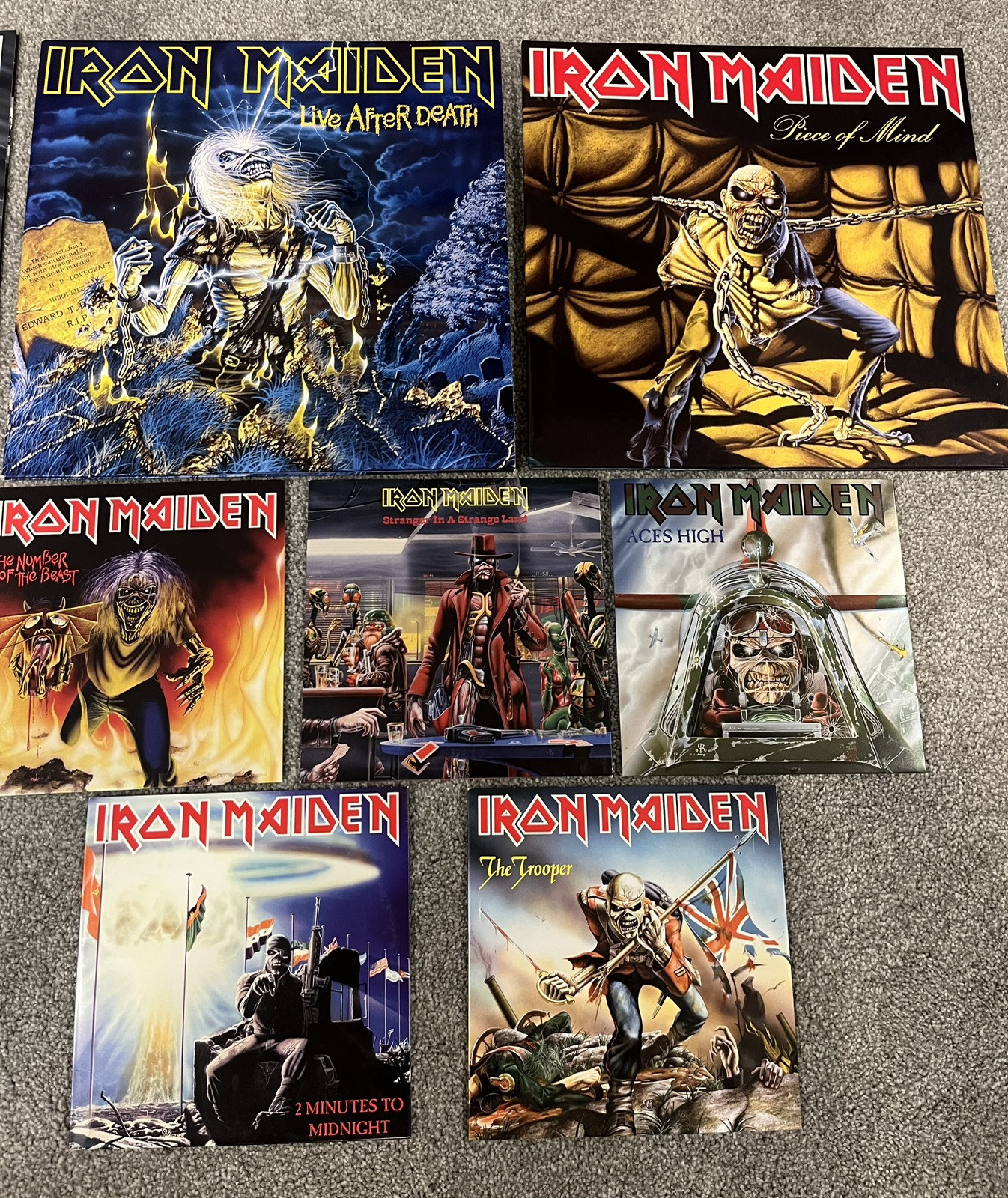 Iron Maiden vinyl collection of 2014 press release, 9 in total, all vinyls are in great condition, minor fingerprints and dust. Includes: 12” vinyls Piece Of Mind The Number Of The Beast Powerslave Life After Death (double LP) 7” vinyl The Trooper 2 Minutes To Midnight Stranger In A Strange land Aces High The Number Of The Beast Very minor scratch type indents that’s unnoticeable , More noticeable but minor cover damage are on the covers listed below. Powerslave cover has a small damage (top right edge) Life after death has minor corner wear and small amount on top edge 2 minutes to midnight has a small crease (bottom left corner The number of the beast has small crease (bottom left corner) LAST FEW PICTURE SHOW THE MORE NOTICEABLE IMPERFECTIONS