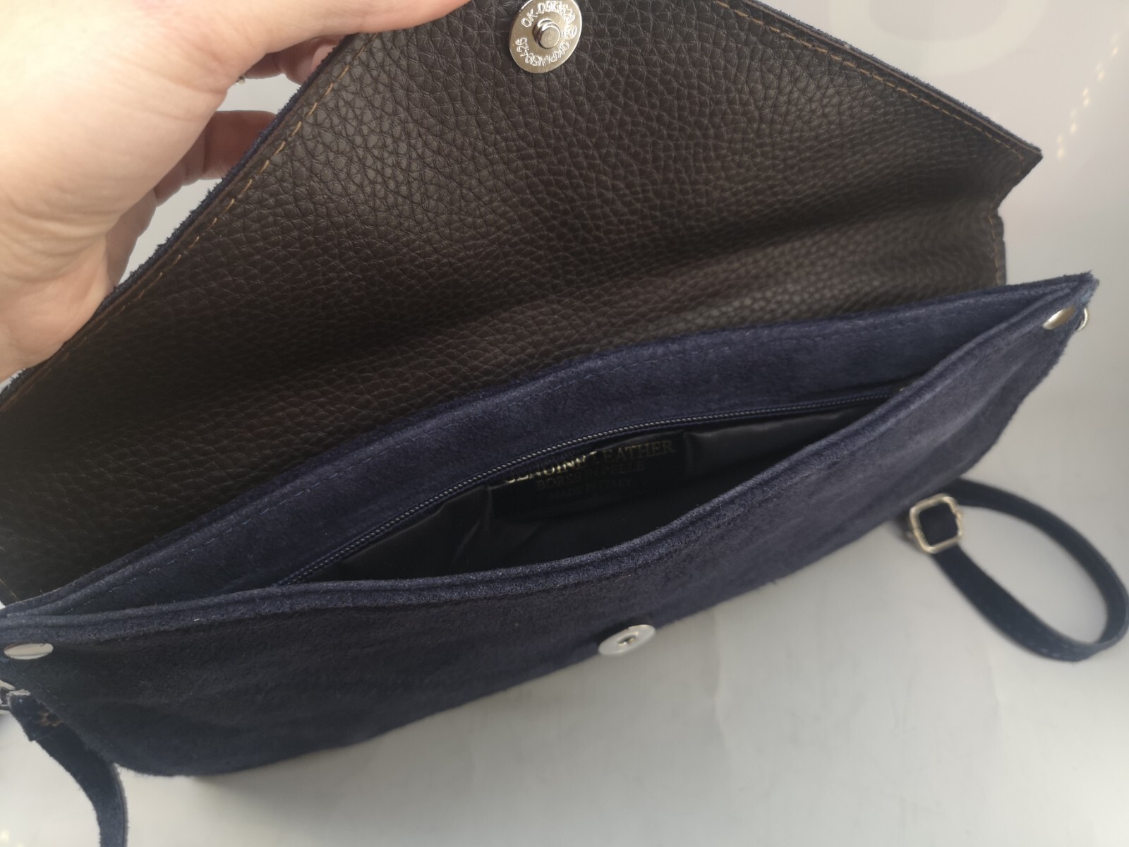 Borse In Pelle Genuine Leather Women Crossbody Bag Italy Women Bag Genuine leather (real leather) classic slim design women bag / crossbody bag, made in Italy (no tags). Dark blue color, dimensions - 30x15 cm. This is an used item with some minor usage marks, as seen on the photos. Worldwide shipping with tracked airmail.