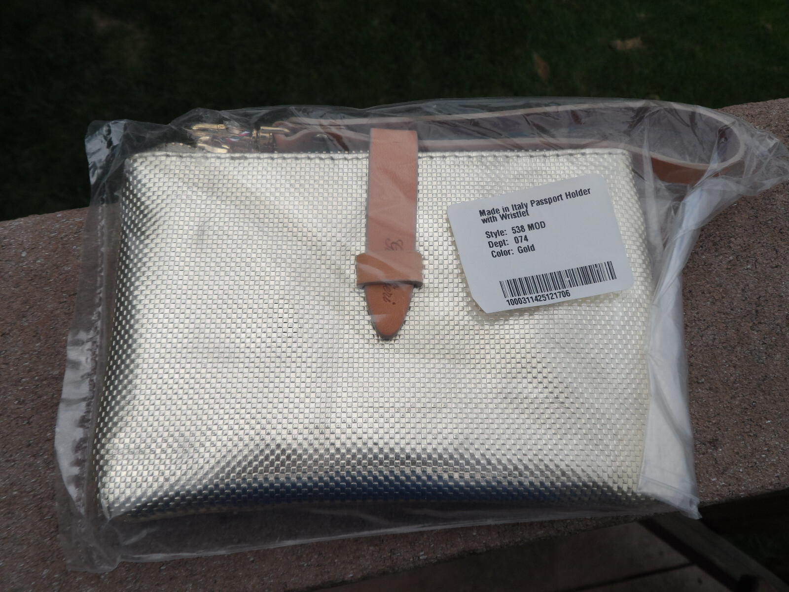 Brand new with tags!!! Genuine leather and made in Italy Features: Gold textured leather Detachable leather wristlet strap and strap detail Measurements: 6.5in W x 4.5in H Zip closure
