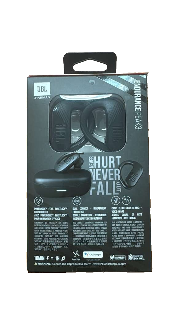 The JBL Endurance Peak 3 Dust and Waterproof True Wireless Active Earbuds in Black offer a high frequency range of 800 feet, making them ideal for outdoor activities. With a double earpiece design and a comfortable ear-hook form factor, these earbuds provide a secure fit for an immersive listening experience. Featuring Active Noise Cancellation, wireless connectivity, replaceable ear tips, and a rechargeable battery, these earbuds are perfect for on-the-go use, whether you're working out or simply enjoying your music. Built-in microphone and sweat-proof construction make these earbuds a versatile and durable choice for any fitness enthusiast.