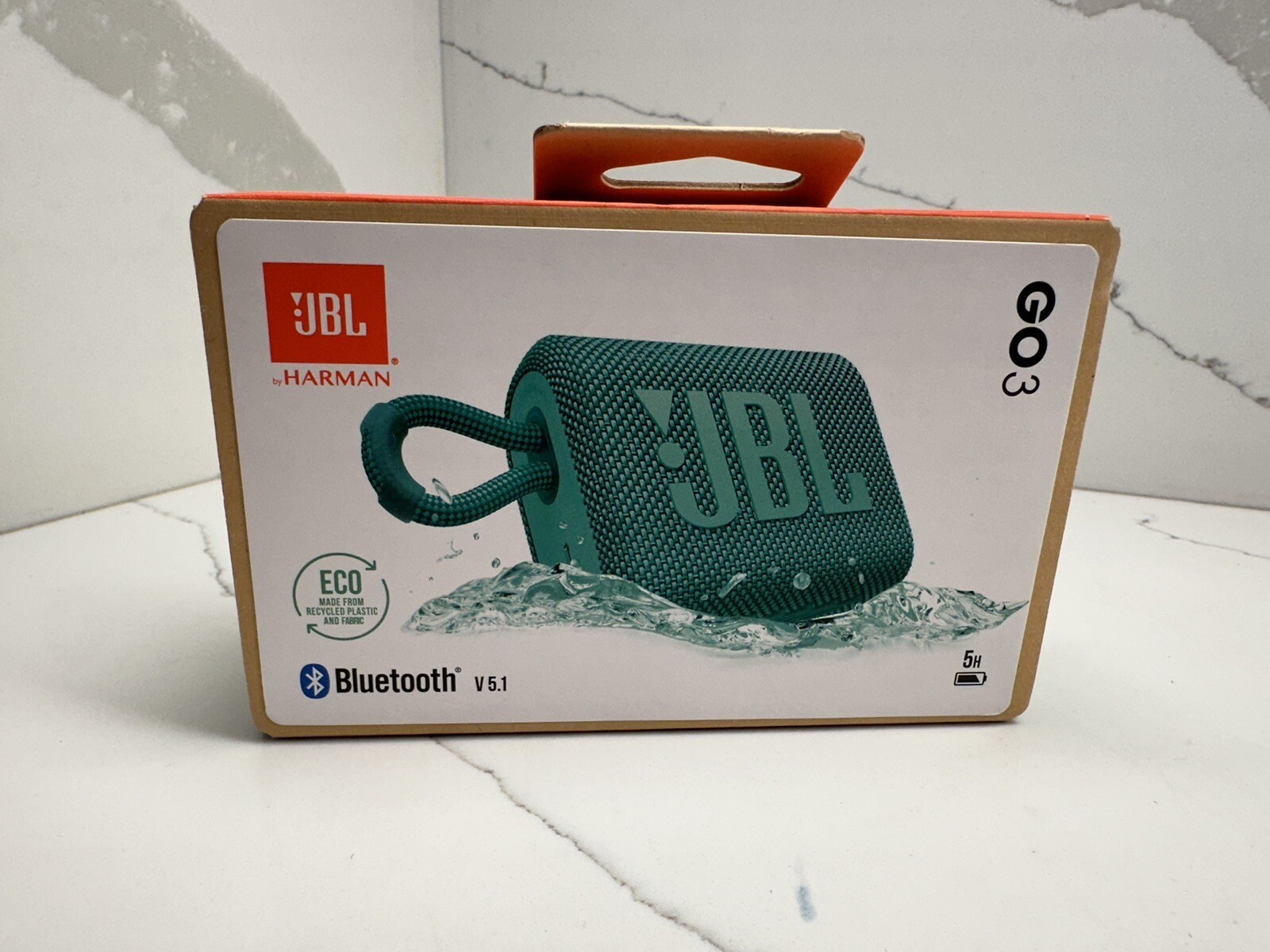 The JBL GO 3 Portable Waterproof Speaker in Teal is a compact rectangular speaker with Bluetooth connectivity. It has a battery capacity of 540 mAh and an RMS power of 4.2 W. This portable speaker is compatible with universal devices and features a green color design. It is lightweight and ideal for on-the-go music listening.