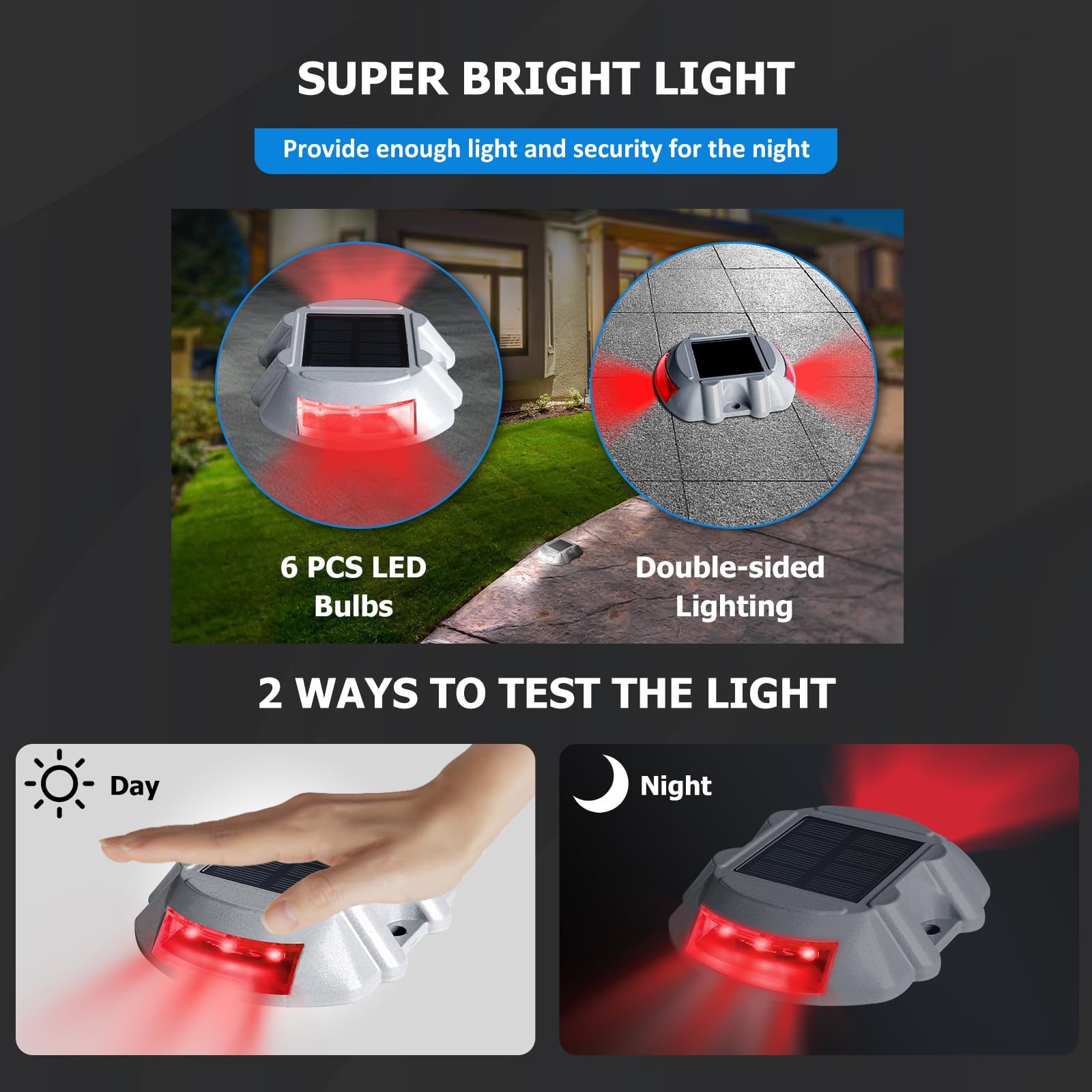 Experience the perfect blend of style and functionality with our Solar Deck Lights. These sleek, rectangular lights are crafted from durable, weather-resistant aluminum and feature a compact, minimalist design that complements any outdoor space. With a powerful 6-LED light source, they emit a warm, inviting red glow, providing up to 12 hours of illumination after a full day's charge. Despite their lightweight design, these lights are built to last, with a crush-resistant construction that can withstand up to 10 tons of pressure. They're also fully waterproof, rated IP68, ensuring they can brave even the harshest weather conditions. Ideal for decks, roads, docks, boats, paths, driveways, gardens, walkways, sidewalks, steps, stairs, or courtyards, these lights are a must-have for any outdoor space. Simply place them where they can absorb sunlight directly, and let them do the rest. For best results, ensure they're charged under strong sunlight for at least 12 hours before first use. ★【SOLAR POWERED CHARGE AUTOMATICALLY-NO NEED SWITCH】 Eco-Friendly Rechargeable solar panels automatically recharge during the day and glow when night falls. Each solar driveway light has 6 LEDs bulbs which give out Intensity and steady light, a built-in 600mAH large battery can provide up to 12 hours of night lighting when in good sunshine charge condition. ★【HIGH QUALITY】The Solar dock light is made of high-quality aluminum casing construction for good resistance to pressure and safety, which can bear a weight of 10 tons. It will not be damaged even the car runs over it. It is can be perfect used for the driveway markers, deck, road, dock, boats, path, driveway, garden, walkway, sidewalk, step, stairs, or courtyard. ★【IP68 WATERPROOF】The driveway lights With IP68 waterproof against any types of terrible weather like a rainstorm, blizzard, or daily heat in a long time. High-quality aluminum materials ensure the light can be used in all kinds of outdoor conditions, even underwater. ★【EASY TO INSTALL】This Solar deck lights can be quickly installed on any ground where they can absorb the sunlight directly. No wiring and operation, you can use the attached screws or glue for fixed installation. ★【NOTE】When using it for the first time, it has to been charged with insufficient sunlight for at least 12 hours, which will better extend the life of the deck light. Our solar lights use high-quality polycrystalline solar panels to make the driveway lights automatically charge during the day for night use.💌If you have any problems with the solar deck light, please contact our after-sales service immediately by email, we will provide you with a 6-month warranty and 24-hour customer service. ★【TIP】This deck light needs to be charged in the strong sunlight during the day for 12 hours to work better, and will be bright enough at night, if insufficient light during the day will cause the light to flicker or not bright enough, this design is to protect the battery. Brightness will return when there is enough sunlight for a full charge.