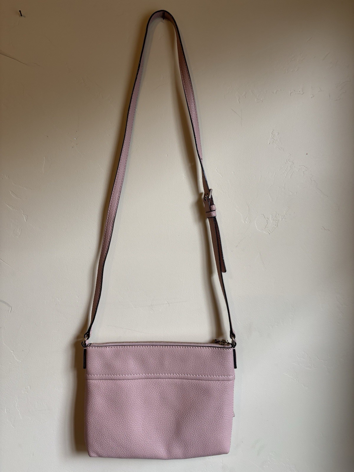 The Kate Spade Jackson Street Gabriele Crossbody Handbag is a stylish and practical accessory for women. Featuring a solid pink exterior made of leather with silver hardware accents, this small rectangular bag has a pebbles character and a striped lining. The handbag has a zip closure, crossbody strap handle style, and inner pockets for organization. Additionally, it comes with a detachable strap for versatility in how it can be carried. Perfect for a night out or a day on the go, this crossbody handbag by Kate Spade New York combines convenience with chic design.