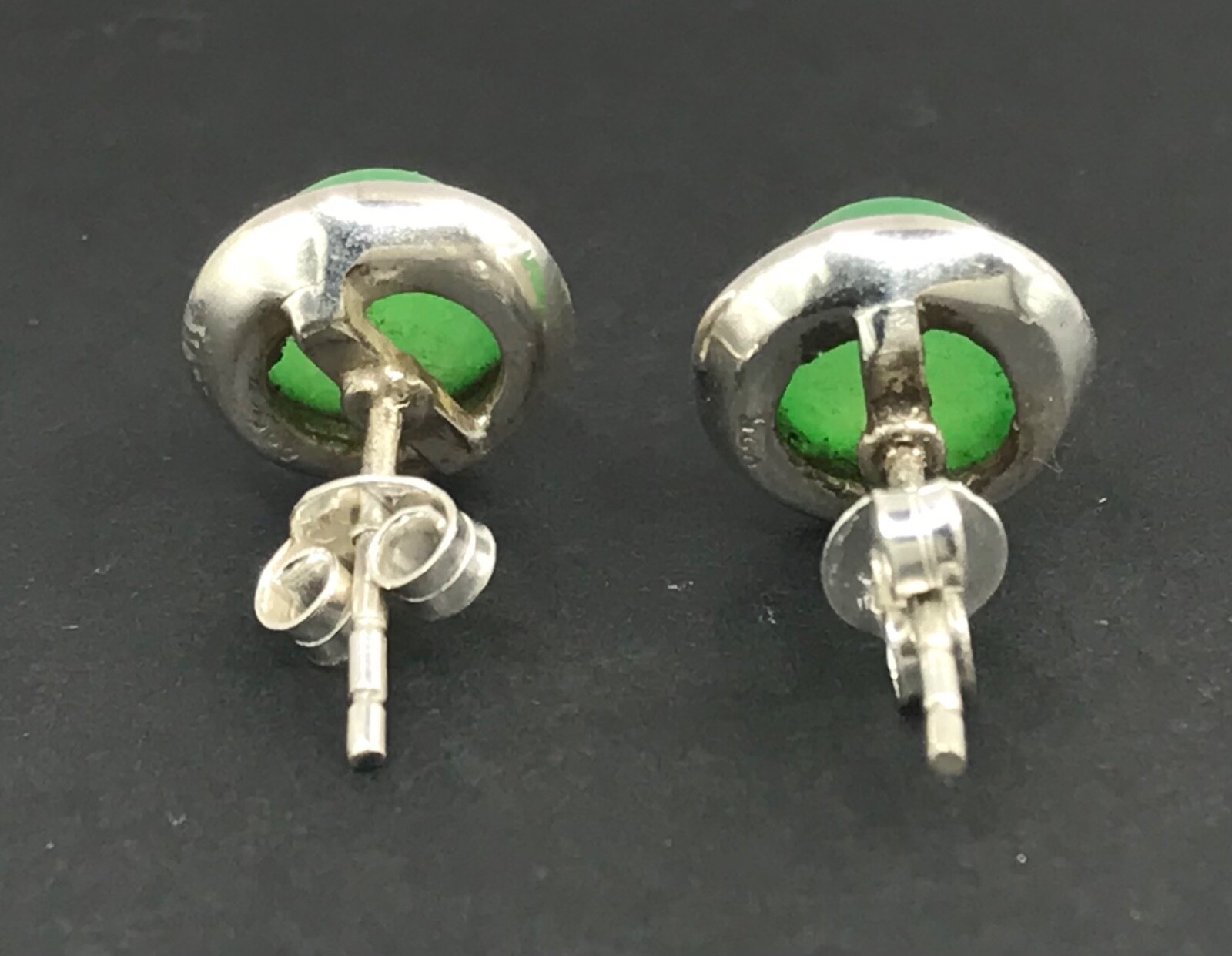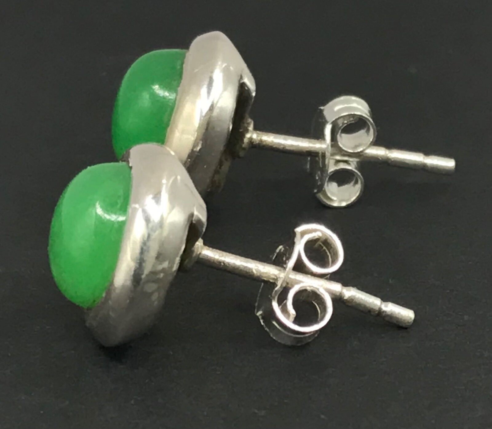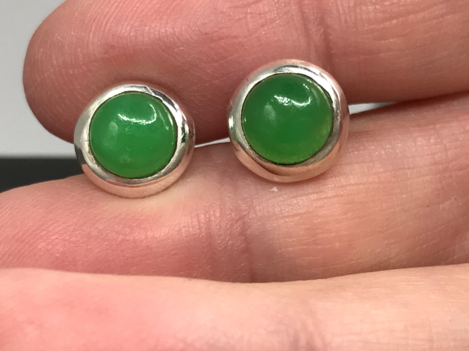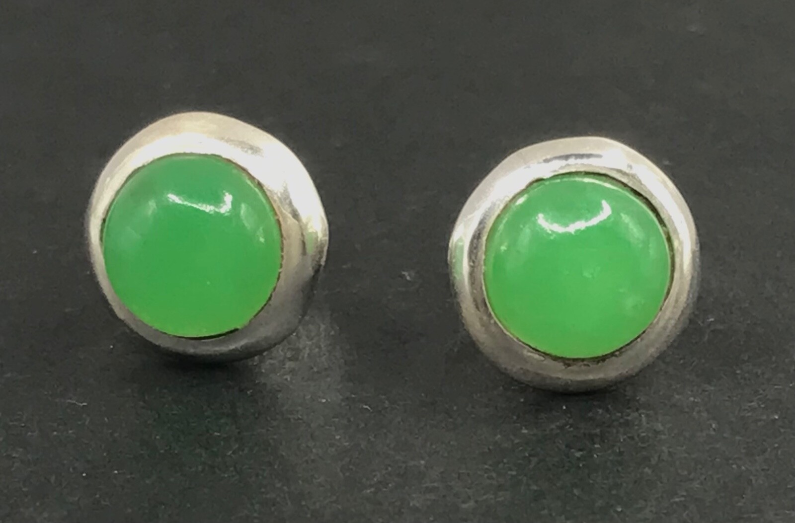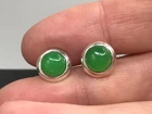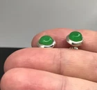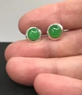 A simple pair of jade stud earrings. Set in solid Sterling Silver. Bezel set, round, 7mm stones. Including settings, studs measure approximately 9mm diameter. New. Marked 925 for solid Sterling silver. Supplied in an attractive gift box. We are an experienced family jewellery business called The Town Jewels, situated in Devon. Thankyou.