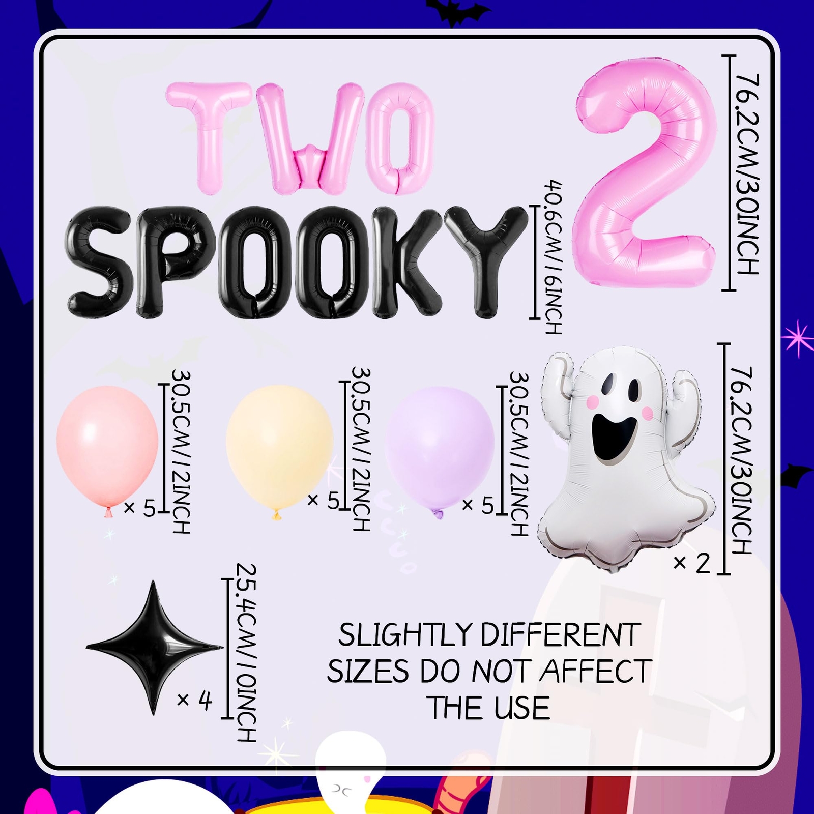 JeVenis Two Spooky Birthday Decorations Boo Im 2 Decoration 2nd Birthday Party Decorations Spooky Birthday Decorations Boo Im 2 Party Supplies Wide application: Two Spooky Birthday Decorations set is specially designed for second birthday party. The balloons adopt pink, black, extremely suitable for girls. The 2nd birthday party decorations are full of vivid and interesting atmosphere, which will make your 2nd birthday decorations for girls an impressive event Easy to Assemble: Our Two Spooky Birthday Decorations is easy to assemble, you can decorate your party whatever you like. Very time-saving Special present to the cherished little one, feel an unforgettable birthday and enjoy this moving moment together What you will receive: 5 x red balloons, 5 x Beige balloons, 5 x purple balloons, 1 x “TWO SPOOKY” balloon, 1 x number “2” balloon, 2 x ghost shaped balloon, 4 x star shaped balloons.Size as picture shows Brand service: If you have any problem, please let me know Wide application: Two Spooky Birthday Decorations set is specially designed for second birthday party. The balloons adopt pink, black, extremely suitable for girls. The 2nd birthday party decorations are full of vivid and interesting atmosphere, which will make your 2nd birthday decorations for girls an impressive event Easy to Assemble: Our Two Spooky Birthday Decorations is easy to assemble, you can decorate your party whatever you like. Very time-saving Special present to the cherished little one, feel an unforgettable birthday and enjoy this moving moment together What you will receive: 5 x red balloons, 5 x Beige balloons, 5 x purple balloons, 1 x “TWO SPOOKY” balloon, 1 x number “2” balloon, 2 x ghost shaped balloon, 4 x star shaped balloons.Size as picture shows Brand service: If you have any problem, please let me know Shipping from the USA All of our products are shipped from the USA, ensuring quick delivery to your destination. Payment We offer the following payment methods: PayPal, credit card, bank transfer, and eBay's secure payment system. Free Shipping & Free Returns Shipping within the USA is FREE. Additionally, any return is absolutely free for you. Risk-Free Purchase You have the option to return an item within 30 days without any justification. We cover the return shipping costs! Fast Shipping We ship immediately upon receipt of payment. Generally, the package is delivered within 2-3 days in the USA. If it takes longer, we will contact you. Quality and Costs Made in Europe, USA, China No customs fees or additional charges Total satisfaction guarantee Invoice with declared VAT available upon request in .pdf format Feedback Your feedback is very important to us. After you pay for your purchase, you will automatically receive positive feedback from us.
