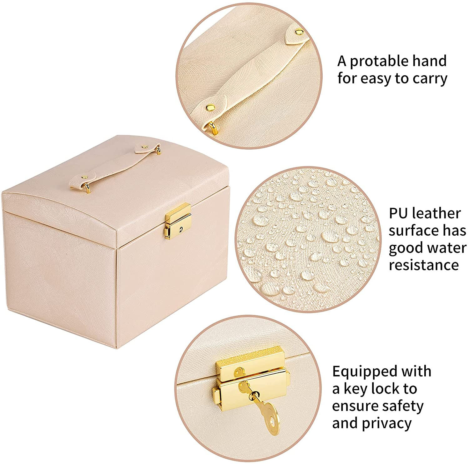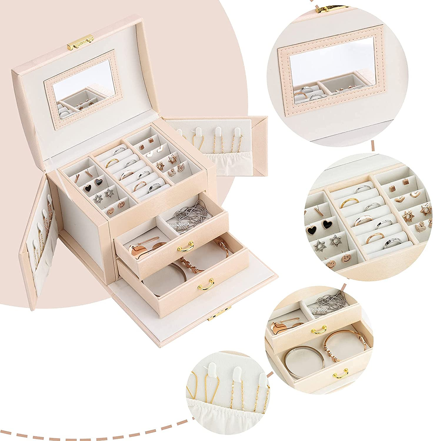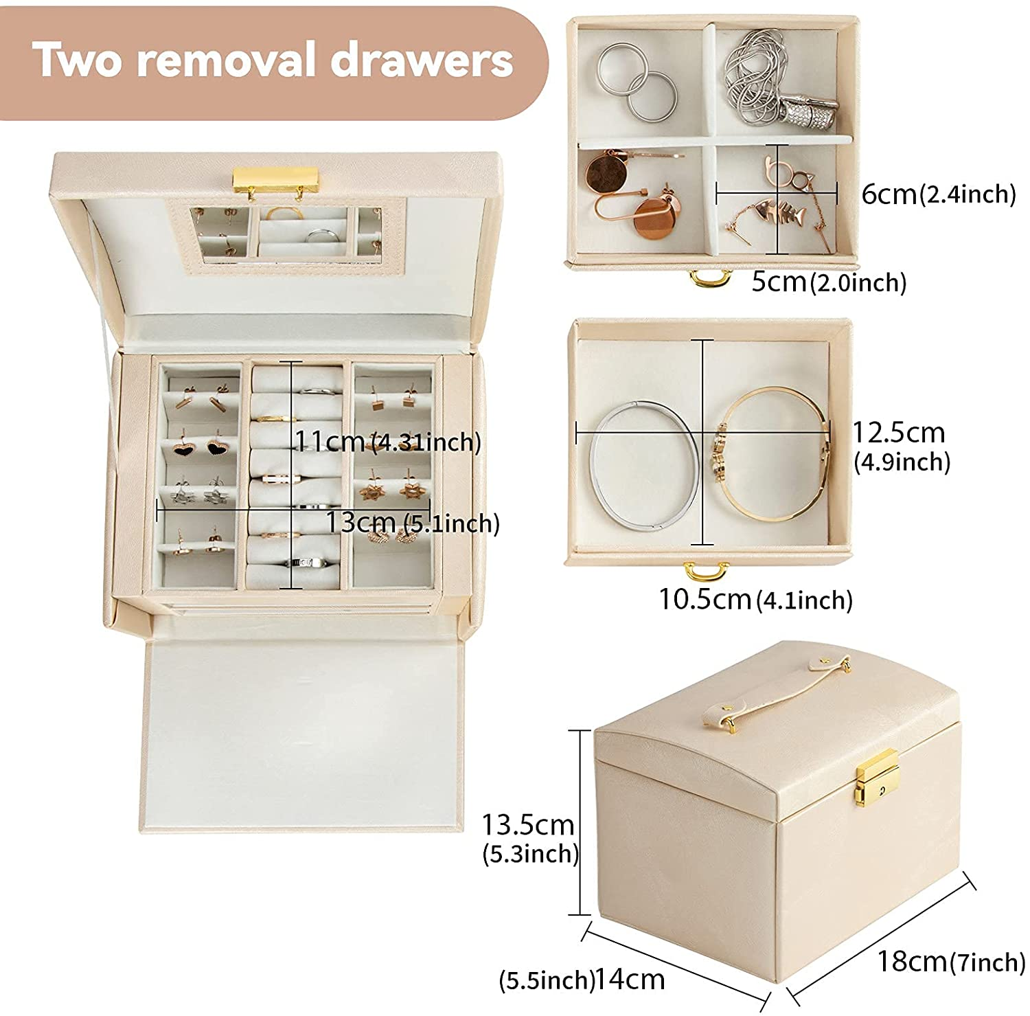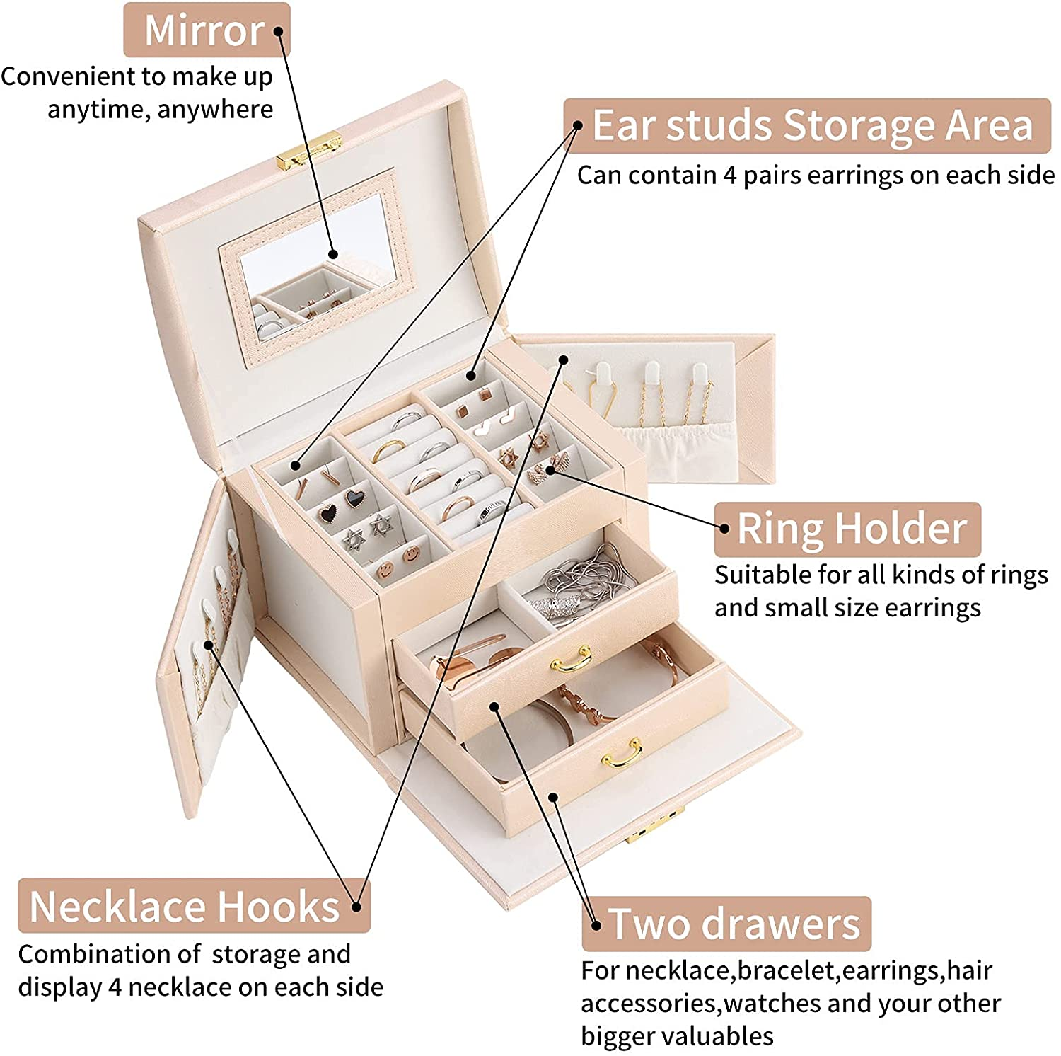 ☑ Large Capacity: Our jewelry boxes have 3 different layers,offer adequate area for your fine jewelry.Multiple separated storage cells with removable dividers for storing jewelries in different size and shape.Including 16 earring stud holes,7 ring rolls,1 large compartment,4 small cubes and 8 necklace hooks with storage pouch which keep chains stay in place. ☑ Great Customer Service: Warminn offer 24 Hours Friendly Customer Service for our honorable customer.If for any reason, you are not completely happy with our beautiful jewelry box,please contact us in time and we will help you well,You can buy with confidence. ☑ Best Gift Choice: Our jewelry organizer with elegant appearance and considerate design is suitable for women of all ages.So it is a ideal gift for your daughter,girlfriend,wife,mother or other loves for Graduation Day,Valentine's Day,Christmas,Birthday,Mothers' day,Anniversary Day or Wedding.Don't be hesitated and hurry to buy them. ☑ Products Dimensions & Materials: Jewelry storage box measures 7inch (L) x 5.5inch (W) x 5.3inch (H).Made of high quality Environmental Friendly PU leather which can can be cleaned with a damp cloth without cracks or peeling and flannel interior on the inside give your valuables quality protection from dust,fingerprints,scratches and damages. ☑ Unique design: Pink jewelry box is equipped with lock key to keep all your Jewelries in safety place to prevent loss and child trouble.The mirror on the top layer is convenient for you to choose the right jewelry to match your makeup.We have also specially expanded the storage space for you and designed two side doors for storaging necklace or other jewelries. ☑ A good Space Saver: With our jewelry organizer box case,all your jewelries will be neatly organized and easy to reach.You will own a bright dresser,saves lots space to make your home looking more elegant and stylish. ☑ Warminn Love Notes: Keep the keys away from children as small parts may pose a choking hazard.