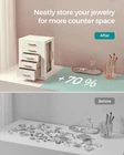 Jewelry Box 360° RotatingJewelry Storage Case with 5 Drawers Jewelry Organizer Glass Window Spacious Vertical Jewelry Storage Open Design Christmas Gift Cloud White UJBC170W01 Description: Creative and Practical United] This jewelry box features vertical storage, an open design, and a 360° rotating function, allowing you to effortlessly display and quickly find your desired jewelry [Spacious Meets Versatile] This 6.3 x 8.7 x 11.2 inches jewelry box is designed with ring slots, necklace hooks, stud earring holes, 5 drawers for brooches and hair accessories, and 18 necklace hooks. It provides convenient storage for all jewelry [Stylish and Protective] This cloud white jewelry storage box features sparkling metal handles, a soft velvet lining, and durable MDF construction, ensuring optimal protection for your expanding jewelry collection [18 Hooks for Long Necklaces] With 9 hooks on both sides, this jewelry box accommodates a variety of necklaces, especially longer ones, keeping them tangle-free and elegantly showcased [Perfect Gift Idea] Present your loved ones with the gift of this exceptional 360° rotating jewelry box on their birthday or anniversary. Or indulge yourself in this exquisite jewelry case because you truly deserve it!
