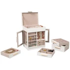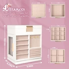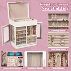 【360° Rotation】This jewelry box combines open design and closed design, which can realize the horizontal storage and vertical display function of jewelry, 360° rotation function, convenient for you to find that jewelry you want at any time. 【Five Sides Storage】This jewelry organizer box has five sides for storage(front, back, left, right and top). 2 closed side compartments are designed with necklace hooks, storage pockets for longer necklaces to prevent tangling. The open front side is designed with ring slots, earring holes, and necklace bracelet metal hooks for easy display. The back side is designed four different style drawers for easy storage of jewelry, hair accessories, brooches, lipsticks and more. The top is designed with flap closure and comes with watch pillows, earring holes for easy storage of bracelets, watches, glasses, earrings, etc. 【Elegant Craftsmanship】This 8.66 x 6.29 x 10.83 inches white jewelry box features soft velvet lining, shiny metal handles and durable MDF construction, all these elements combine for both practicality and beauty, no matter where it is placed, it can be a charming part of your room decor. 【Clear Glass Lid】The clear glass lids on both sides of this jewelry box large allow you to see and find your favorite necklaces at a glance, which is not only beautiful and convenient to display, but also protects them from dust and protects your precious necklace jewelry for a long time. 【Large Jewelry Box】This jewelry box organizer has a large number of different compartments, slots and hooks, which makes it convenient for you to sort and organize different types of jewelry. Whether you put it in your bedroom or checkroom, this modern jewelry box for women can meet all your daily makeup needs, keep your desktop clean and create a comfortable and tidy environment.