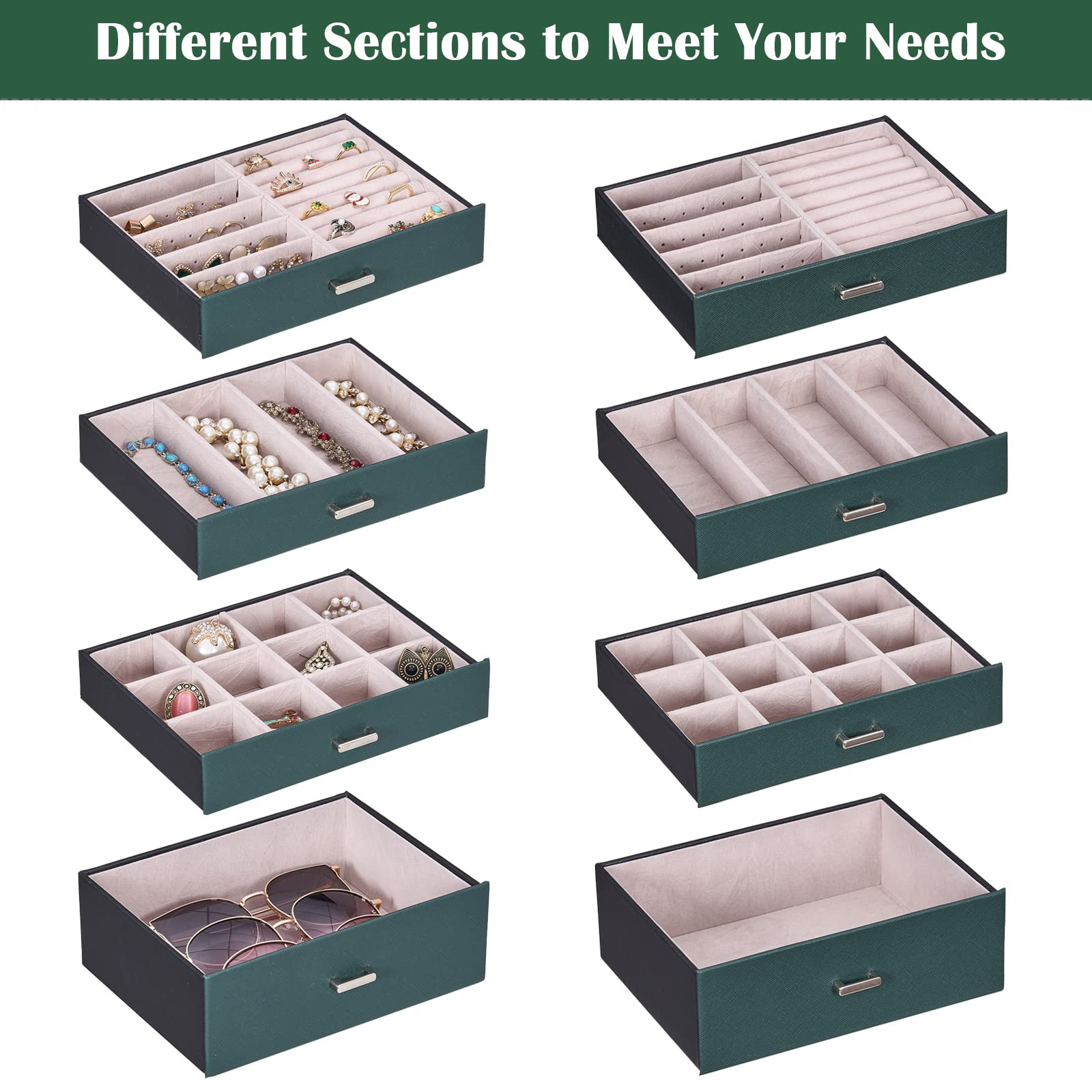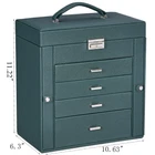 LARGE CAPACITY JEWELRY BOX:5-tier and 2-wings can organize all your jewelry. The top layer with lock and mirror to store valuable jewellery. Contains 4 pillows, 4 earring grids and 7 ring cushions, 12 equal-sized squares, one large sunglasses grid. The middle 3 layers can be interchanged MULTI-FUNCTIONAL JEWELRY ORGANIZER:The jewelry box It can be put a couple watches, earrings, rings, necklaces, hairpins,brooches, bracelets, and some sunglasses distributed into all the drawers. Avoid jewelry tangle and loss and tarnish in the air, keep your desktop neat and clean STURDY and ELEGANT for WOMEN:The jewelry box frame is made of medium density fiberboard, the structure is stable and will not dent or fall apart. The exterior is Faux Leather, which can be cleaned with a damp cloth without cracks or peeling. The interior soft velvet lining can protect your jewelry from scratches.Elegant and suitable for women of all ages JEWELRY ORGANIZER BOX with LOCK and MIRROR: Intimate and convenient. You can save your precious jewelry box in the lockable grid to prevent loss and child trouble. The mirror on the top layer is convenient for you to choose the right jewelry to match your makeup, and find the objects you want more quickly GIFTABLE-BEAUTIFULLY CRAFTED:The jewelry box exquisite workmanship and exquisite hardware. For GF, MOM and daughter, it is a good choice for Valentine's Day, Mother's Day, birthday or Christmas SMALL FOOTPRINT: 10.67" L x 11.30" H x 6.22 W, It can be placed on your dressing table or vanity, it will not take up a ton of space