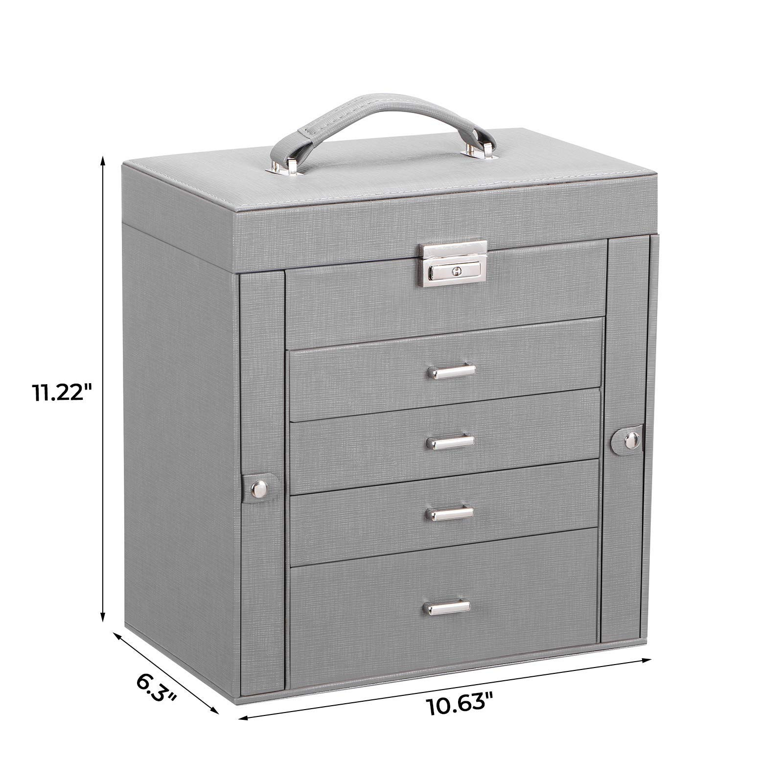 LARGE CAPACITY JEWELRY BOX:5-tier and 2-wings can organize all your jewelry. The top layer with lock and mirror to valuable jewellery. Contains 4 pillows, 4 earring grids and 7 ring cushions, 12 equal-sized squares, large sunglasses grid. The middle 3 layers can be interchanged SMALL FOOTPRINT: 10.67" L x 11.30" H x 6.22 W, It can be placed on your dressing table or vanity, it will not take up a ton of space MULTI-FUNCTIONAL JEWELRY ORGANIZER:The jewelry box It can be put a couple watches, earrings, rings, necklaces, hairpins,brooches, bracelets, and some sunglasses distributed into all the drawers. Avoid jewelry tangle and loss and tarnish in the air, keep your desktop neat and clean STURDY and ELEGANT for WOMEN:The jewelry box frame is made of medium density fiberboard, the structure is stable and will not dent or fall apart. The exterior is Faux Leather, which can be cleaned with a damp cloth without cracks or peeling. The interior soft velvet lining can protect your jewelry from scratches.Elegant and suitable for women of all ages JEWELRY ORGANIZER BOX with LOCK and MIRROR: Intimate and convenient. You can save your precious jewelry box in the lockable grid to prevent loss and trouble. The mirror on the top layer is convenient for you to choose the right jewelry to match your makeup, and find the objects you want more quickly GIFTABLE-BEAUTIFULLY CRAFTED:The jewelry box exquisite workmanship and exquisite hardware. For GF, MOM and daughter, it is a good choice for Valentine's Day, Mother's Day, birthday or Christmas