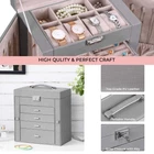 LARGE CAPACITY JEWELRY BOX:5-tier and 2-wings can organize all your jewelry. The top layer with lock and mirror to valuable jewellery. Contains 4 pillows, 4 earring grids and 7 ring cushions, 12 equal-sized squares, large sunglasses grid. The middle 3 layers can be interchanged SMALL FOOTPRINT: 10.67" L x 11.30" H x 6.22 W, It can be placed on your dressing table or vanity, it will not take up a ton of space MULTI-FUNCTIONAL JEWELRY ORGANIZER:The jewelry box It can be put a couple watches, earrings, rings, necklaces, hairpins,brooches, bracelets, and some sunglasses distributed into all the drawers. Avoid jewelry tangle and loss and tarnish in the air, keep your desktop neat and clean STURDY and ELEGANT for WOMEN:The jewelry box frame is made of medium density fiberboard, the structure is stable and will not dent or fall apart. The exterior is Faux Leather, which can be cleaned with a damp cloth without cracks or peeling. The interior soft velvet lining can protect your jewelry from scratches.Elegant and suitable for women of all ages JEWELRY ORGANIZER BOX with LOCK and MIRROR: Intimate and convenient. You can save your precious jewelry box in the lockable grid to prevent loss and trouble. The mirror on the top layer is convenient for you to choose the right jewelry to match your makeup, and find the objects you want more quickly GIFTABLE-BEAUTIFULLY CRAFTED:The jewelry box exquisite workmanship and exquisite hardware. For GF, MOM and daughter, it is a good choice for Valentine's Day, Mother's Day, birthday or Christmas