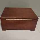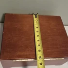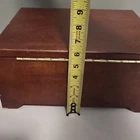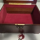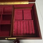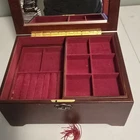 My beloved jewelry box has been with me for 25+ years! Red velvet lining, two adjustable sliding drawers with ring holders and compartments, large compartment beneath, mirror and hunged door. Selling as is. Key included and works with lock.