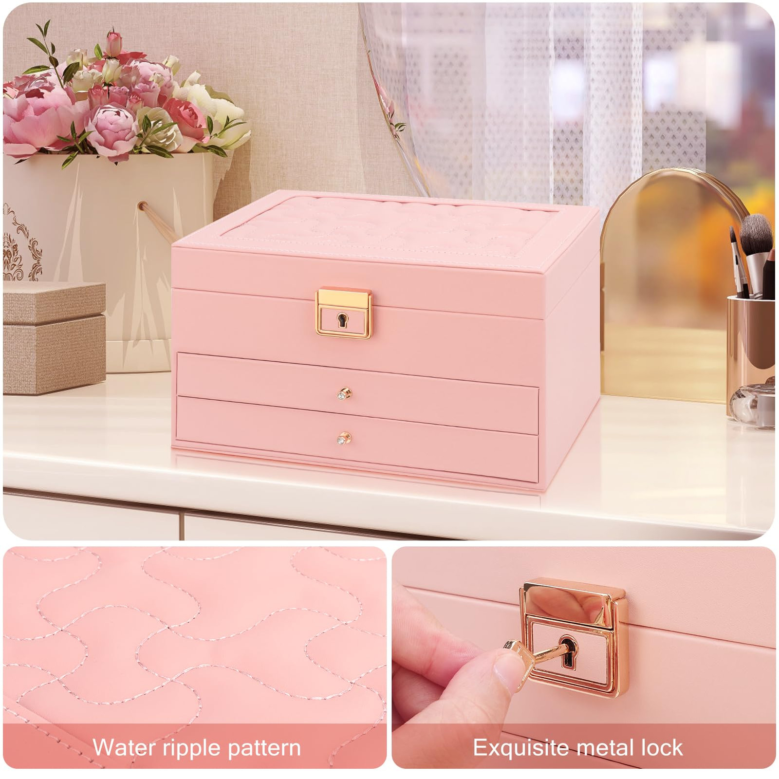 【Jewelry Box Organizer】:The jewelry box has three layers. The upper level is the tray, with grooves for rings, earring stud trays and places for watches. The bottom two levels are drawers with removable dividers that you can use as you wish according to the size of your jewelry. There are also 8 necklace hooks on the lid of the open jewelry box. 【Fashion Design】:Compared with other jewelry boxes, our jewelry box has a water ripple pattern design. The design of the metal luster lock and handle adorn the jewelry box, coupled with the delicate golden key, make the jewelry box look more high-end, fashionable and beautiful. 【Waterproof & Soft】:The jewelry storage case is made of high quality faux leather and soft velvet lining. Not only is it waterproof, the soft velvet material also protects your jewelry from scratches and damage. There are also three small mesh bags, three PVC bags and a cloth to wipe the jewelry inside the jewelry storage case to better care for your precious jewelry. 【Convenient Storage】:The size of the jewelry box is 23*17*13.5cm/9.1x6.7x5.3in. Can meet your various jewelry storage. The jewelry box keeps your jewelry organized and keeps your desk clutter-free. You also don't have to waste time looking for your jewelry. 【Suitable for Using】:Jewelry organizer is the gift for Mother, Friends, Colleagues, Wife or Girlfriend etc. for Valentine's Day, Christmas, New Years, Birthdays, Weddings etc. This jewelry organizer will be a lovely gift to keep.