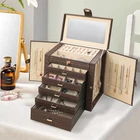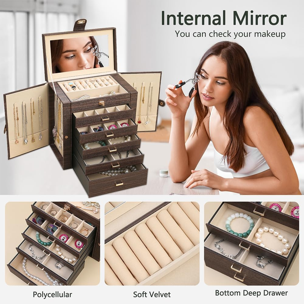 Display your jewelry collection with sophistication: Our elegantly designed jewelry box organizer is the ideal showcase for your precious pieces. With dimensions of 6.49" x 10.6" x 11.02" when closed, this jewelry box strikes the perfect balance between fashion and functionality, making it a flawless addition to any dressing table Exude Elegance: Made for women, our jewelry box organizer combines style and functionality. Equipped with a beautiful mirror and five cleverly designed drawers, each with a unique size: 7.8" x 6.4", 3.6" x 6.4", 3" x 3.2", 2" x 1.8", 1.5" x 1.6". Perfect for storing earrings, rings, necklaces and bracelets, they are easily accessible and neatly organized, adding a touch of sophistication to your jewelry collection Show desktop elegance: Our jewelry box desktop drawer organizer, with a base size of 6.7" x 10.8", will save you valuable workspace. The unique Wood Grain Color finish adds a touch of charm to your decor while cleverly organizing your small jewelry, keeping your desktop tidy and full of stylish taste. Give your workspace an elegant atmosphere Travel in style and security: Our jewelry organizer storage box handle is meticulously crafted for travel, featuring 2 hidden wings on both sides, 16 hooks, and 4 pockets to cater to all your necklace storage needs and prevent tangling while on the move. This compact yet spacious travel jewelry box ensures your jewelry stays safe and tangle-free, making it the perfect companion for your journey. Carry your favorite jewelry with confidence wherever your adventures take you Thoughtful Gift for Loved Ones:Delight your friends and family with the gift of lasting organization. Our large jewelry organizers and storage make thoughtful gifts for any occasion, combining beauty and practicality. Perfect for women, these storage solutions are sure to be cherished for years to come