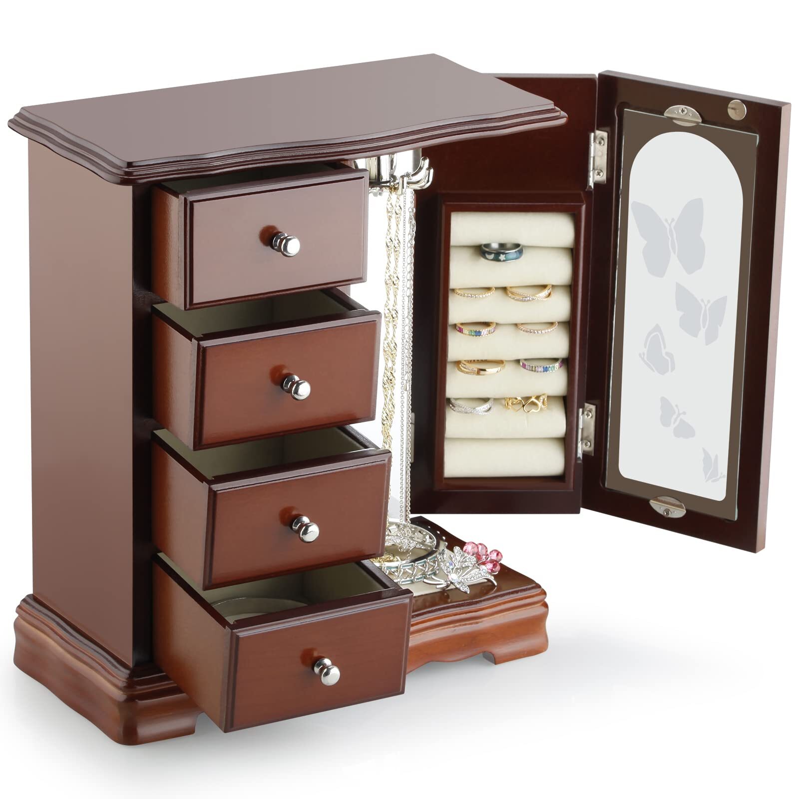 Jewelry Box - Made of Solid Wood with 4 Drawers Organizer and Built-in Neckla...