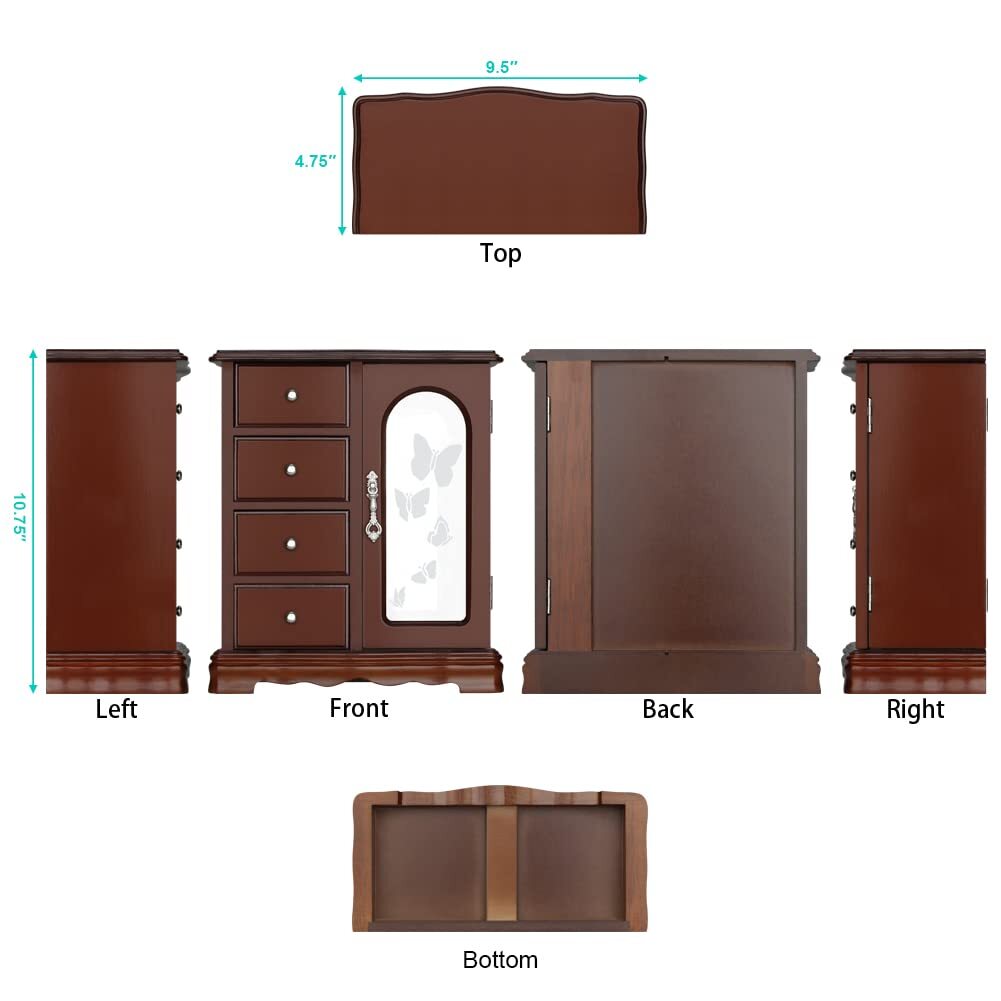 💝THE ROUND RICH HIGH-GRADE JEWELRY BOX:High-end natural hardwood structure, Anti-Tarnishing velvet lining, exquisite hardware decoration, harmonious color match, highlighting taste and nobility. Packaged in a beautiful GIFT BOX, a gift that women will not refuse! 💝External design:The top and bottom adopt the unique design style of wavy shape, 4-Drawers storage, each drawer has a silver handle. It looks beautiful and easy to open or close the drawer. 360 degree fully open butterfly pattern revolving glass door, adsorption of magnets when closed. The appearance is smooth, clean, comfortable and beautiful. 💝Internal Multifunctional Design:Removable square drawer on the left, large space storage (It can store necklaces, bracelets, earrings, earpins, hairpins, watches, rings and other jewellery accessories). The right side is equipped with stereo lenses, making it easier to choose jewelry to match your own clothes; The top is equipped with necklace carousel horse, which can hang a variety of jewelry; and a multi-layer velvet ring storage device. 💝Size:Jewellery box 9.5" x 4.75" x 10.75" (L*W*H); Drawer Internal Space 3.2" x 3.2"x 1.8" (L*W*H); Mirror Size: 3.5" x 9.25". 💝This elaborate jewelry box will protect all your accessories from scratches and offers a clean storage environment for jewelry.