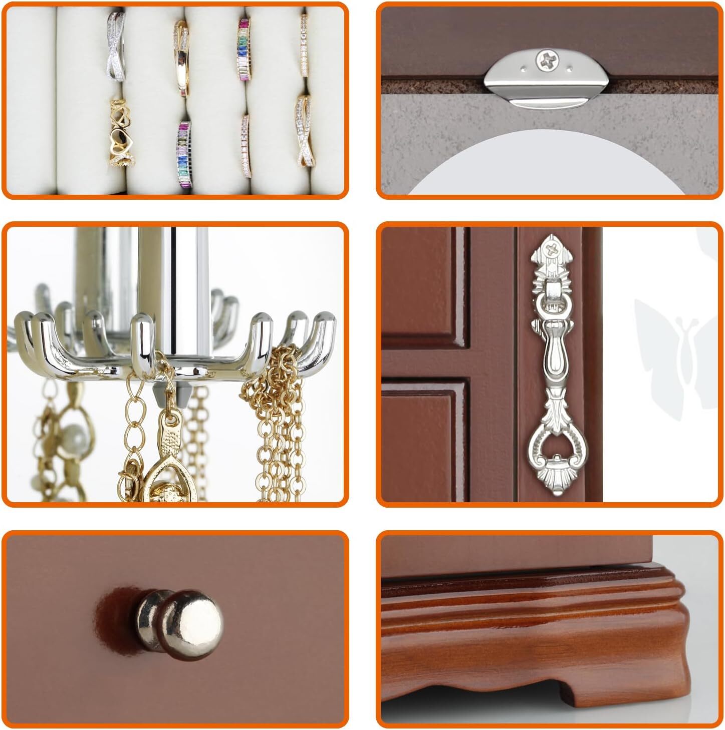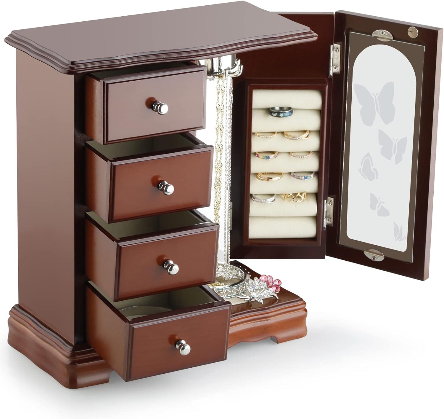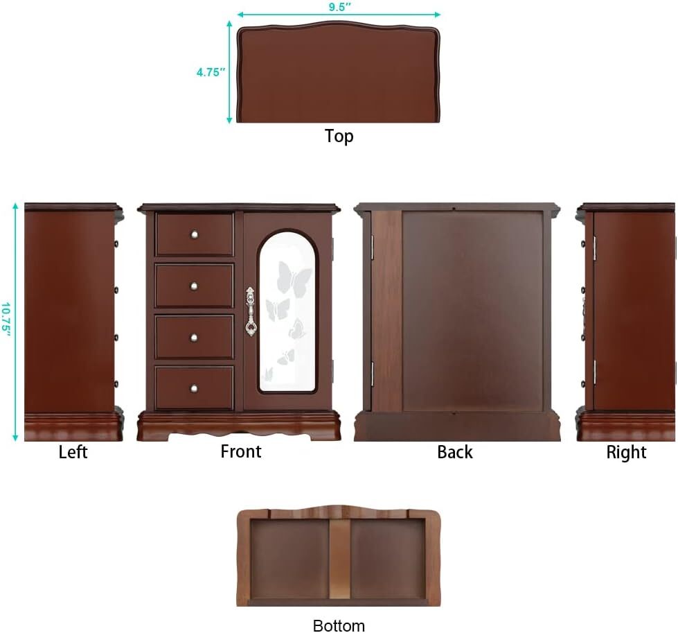About this item đź’ťTHE ROUND RICH HIGH-GRADE JEWELRY BOX:High-end natural hardwood structure, Anti-Tarnishing velvet lining, exquisite hardware decoration, harmonious color match, highlighting taste and nobility. Packaged in a beautiful GIFT BOX, a gift that women will not refuse! đź’ťExternal design:The top and bottom adopt the unique design style of wavy shape, 4-Drawers storage, each drawer has a silver handle. It looks beautiful and easy to open or close the drawer. 360 degree fully open butterfly pattern revolving glass door, adsorption of magnets when closed. The appearance is smooth, clean, comfortable and beautiful. đź’ťInternal Multifunctional Design:Removable square drawer on the left, large space storage (It can store necklaces, bracelets, earrings, earpins, hairpins, watches, rings and other jewellery accessories). The right side is equipped with stereo lenses, making it easier to choose jewelry to match your own clothes; The top is equipped with necklace carousel horse, which can hang a variety of jewelry; and a multi-layer velvet ring storage device. đź’ťSize:Jewellery box 9.5" x 4.75" x 10.75" (L*W*H); Drawer Internal Space 3.2" x 3.2"x 1.8" (L*W*H); Mirror Size: 3.5" x 9.25". đź’ťThis elaborate jewelry box will protect all your accessories from scratches and offers a clean storage environment for jewelry. Product Description RR ROUND RICH DESIGN High-end and fashionable wooden jewelry boxes Product Description Cabinet three-dimensional design, Selected materials and fine workmanship create a fashionable look adding decor to your home. Wedding gifts, birthday gifts, this is your best choice! EcoFriendlyMaterial, add elegance to this jewlery case, durable. Moisture and corrosion resistant. Velvet liner is moisture and corrosion resistant and offers a clean storage environment for jewelry. Wooden Jewelry Case Material: Wood. Surface Cover Material: Environmentally paint, glass. Care and cleaning: Wipe clean, put in shade, dry, ventilated. Color: Brown Weight: 4.3 pounds Dimensions: 9.5" x 4.75" x 10.75" (L*W*H) 4-Drawers internal size: 3.2" x 3.2"x 1.8" (L*W*H) Placement position: Shading Exquisite and removable storage drawers. 8-claws Necklace hook capable of rolling and rotating freely. Classic and elegant bronze door handle Multi layer velvet ring slots Cabinet jewelry box Cabinet jewelry box Cabinet jewelry box Cabinet jewelry box Cabinet jewelry box Cabinet jewelry box Dimensions 9.3 x 4.75 x 10.75 inches 10.25 x 5.5 x 11.75 inches 9 x 4.7 x 9.3 inches 9.25L x 4.75W x 10.75H inches 11.63L x 5.5W x 12.13H inches 13.5L x 5W x 13.2H inches Cabinet jewelry box Cabinet jewelry box Cabinet jewelry box Cabinet jewelry box Cabinet jewelry box Cabinet jewelry box Dimensions 9.3 x 4.75 x 10.75 inches 10.25 x 5.5 x 11.75 inches 9 x 4.7 x 9.3 inches 9.25L x 4.75W x 10.75H inches 11.63L x 5.5W x 12.13H inches 13.5L x 5W x 13.2H inches Cabinet jewelry box Cabinet jewelry box Tower storage box Cabinet jewelry box Cabinet jewelry box Cabinet jewelry box Item Dimensions 9.3 x 4.75 x 10.75 inches 10.25 x 5.5 x 11.75 inches 10 x 6.4 x 6 inches 9.25L x 4.75W x 10.75H inches 11.63L x 5.5W x 12.13H inches 13.5L x 5W x 13.2H inches On Jul 23, 2024 at 03:54:09 PDT, seller added the following information: On Sep 20, 2024 at 19:42:32 PDT, seller added the following information: