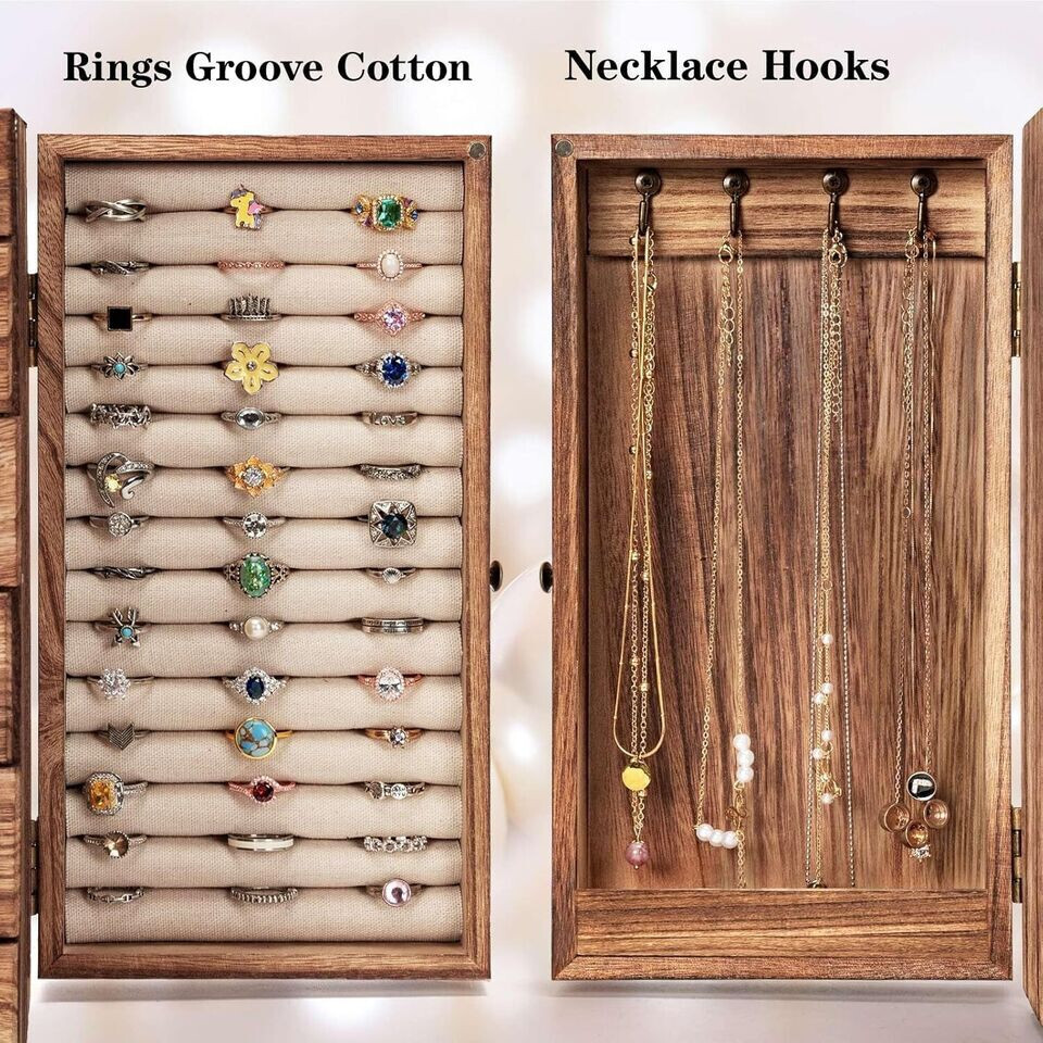Jewelry Box Organizer, Large Jewelry Boxes for Women, Great Storage Earring Orga (US WAREHOUSE - FAST SHIP USA) Large capacity: jewelry box perfect blend of style and functionality, designed to keep your precious items organized and easily accessible. With its impressive dimensions of 8.6" x 5.9" x 12", this jewelry organizer box features a generous capacity that includes five layers of drawers, each thoughtfully designed to accommodate a variety of jewelry types—from necklaces and bracelets to earrings and rings New design:Crafted from high-quality wooden material, this jewelry organizers and storage embraces a charming rustic aesthetic, breaking away from the traditional leather styles. Its unique design adds a touch of elegance to any space while providing a sturdy and reliable storage solution for your accessories Preferred Gift:This beautiful jewelry storage box is not only a practical addition to your decor but also a thoughtful gift for the special women in your life. Its versatile appeal makes it an ideal present for occasions such as Christmas, Valentine's Day, Mother's Day, and anniversaries—perfect for surprising a beloved girlfriend, wife, or friend Jewelry Storage & Display Case:Elevate your jewelry case game with our stylish and spacious wooden jewelry box—a must-have accessory for every jewelry lover! Transform clutter into elegance and discover the joy of a beautifully curated collection that’s always at your fingertips. Don’t miss out on this essential jewelry box that brings beauty and order to your treasured belongings Jewelry Box and Rings & Necklace Organizer: Separate storage for necklaces and rings on each side, with individual hooks for necklaces and organizer pockets at the top and prevent tangling Product description Product Features: Frame Material: Premium Natural Wood Interior Material: Soft Linen Color: Rich Carbonized Brown Size: 12 x 8.6 x 5.9 inches Weight: 3.8 lbs Rustic Farmhouse Charm Crafted with a unique carbonized finish, this jewelry organizer exudes rustic farmhouse elegance. The rich brown color enhances the natural wood grain, giving each piece a distinctive and timeless appeal. Its warm, natural look complements any décor, adding a touch of vintage charm to your space.