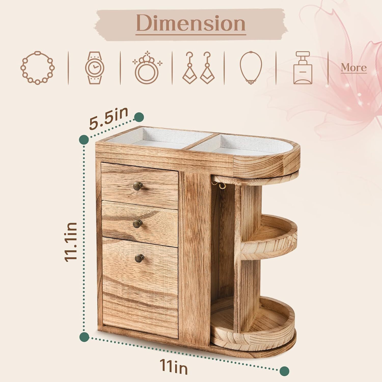 Free eBay listing template designed by dewiso.com Wood Jewelry Box, Solid Wooden Rotating Jewelry Box Organizer for Women, Christmas Gifts for Girls - 4 Layer Rustic Small Jewelry Organizer Box with 3 Drawers for Necklace Ring Earring Bracelet FREE AND FAST SHIPPING! About this item Multifunctional Jewelry Storage - This exquisite jewelry box has multiple compartments, including 3 drawers and 5 jewelry trays, suitable for storing rings, earrings, bracelets, bracelets, earrings and other jewelry. The rotating design on the side can hang long necklaces or pendants, perfectly meeting your daily needs. Unique Design - This jewelry box comes with a ring holder, necklace hook, 2 drawers of equal size and 5 jewelry trays, which is enough to hold most of your jewelry. The necklace hanger on the side has a total of 6 hooks and 3 small jewelry trays, and the rotating design makes it easy to take jewelry. Quality Material and Protection - Designed with real wood and fine linen lining, this wooden jewelry box offers all-around protection for your treasures against scratches and tarnishes. Its simple design and rustic appearance add a fun, vintage feel to your room décor. Ideal Gift for Women- With exquisite craftsmanship and an elegant appearance, this jewelry box makes an ideal gift for Valentine’s Day, Mother’s Day, Thanksgiving, Christmas, and birthdays. Whether for your mom, wife, girlfriend, or any important woman in your life, it is sure to bring a dazzling smile when received. Space Saving - The jewelry box measures 11.1 x 11 x 5.5 inches, and its compact design is perfect for placing on your dresser, bedside table, bathroom countertop or makeup table, saving space and making your room look more tidy. › Product We offer a 30-Day Return Policy on items which you are not completely satisfied with. You have the option for a full-refund or an exchange of the item. No returns are available on items shipped outside of the US . Shipping We offer Free Shipping to the US and ship within 2 business days of payment, usually sooner. We use UPS express shipping. That's why your products are usually delivered within 3 days . Contact We try our very best to make sure every customer is completely satisfied. If there's a problem , message us! We're happy to help. 24/7 live chat available.