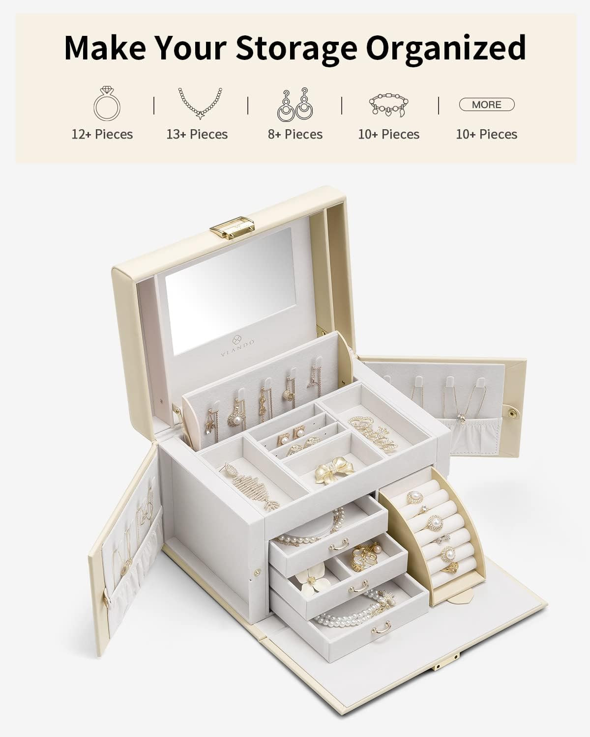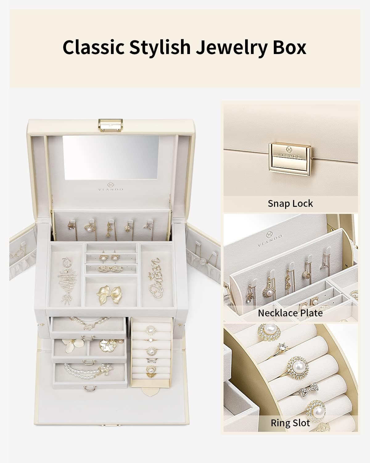 Multi-functional Storage Design - The jewelry box features 3 small accessory drawers, 2 extendable necklace boards and 1 extendable ring holder. With customizable storage compartments, you can easily organize all your jewelry in one stylish box Crafted with High-Quality Materials - luxurious synthetic leather jewelry box is resistant to moisture and scratches. The sleek exterior and premium velvet interior lining make it a stunning addition to any room Full Protect Jewelry - Keep your treasured jewels safe and sound with the soft lining that surrounds each piece. Your jewelry will always look as good as new, no matter how often you wear it Versatile Use - The compact size and carrying handle make this jewelry box organizer ideal for traveling or cloakroom . You can bring a variety of jewelry accessories to make your look different for every day WARM GIFT CHOICE - If your female friend or daughter loves jewelry, this will be the sweet gift ever. This makes for an ideal gift for, Valentine's Day, Christmas, or any special occasion to show your love and care for your family, partner, or friends