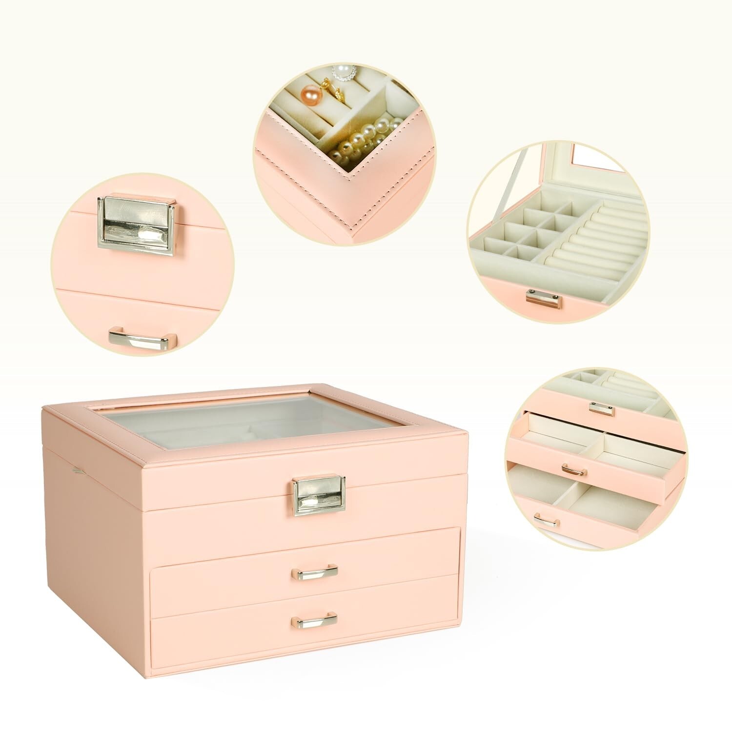 Jewelry Box for Women | 3-Layers Jewelry Organizer Storage Display with Glass Lid and 3 Drawers | Large Capacity for Necklace Earrings Bracelets Ring(Pink) Product Details Color: Pink Brand: DQUTAR MPN: DQT-10-Pink UPC: 706047783097 EAN: 0706047783097 Color: Pink Brand: DQUTAR Material: PU Leather+ velvet Style: Modern Special Feature: Durable,Jewelry Organizer,Large Capacity Recommended Uses For Product: Ring Product Dimensions: 9.05"D x 7.87"W x 5.32"H Target Audience: Women Shape: Rectangular Occasion: Friendship Day, New Year, Wedding, Thanksgiving, Valentine's Day Item Weight: 3 Pounds Item Dimensions D x W x H: 9.05"D x 7.87"W x 5.32"H Manufacturer: STARDREAM JEWEL UPC: 706047783097 Brand Name: DQUTAR Recommended Uses For Product: Ring Target Audience: Women Number of Compartments: 9 Number of Drawers: 2 Jewelry Storage Type: Jewelry Box Mounting Type: Table Top Closure Type: Button Special Features: Durable,Jewelry Organizer,Large Capacity Shape: Rectangular Occasion: Friendship Day, New Year, Wedding, Thanksgiving, Valentine's Day Style: Modern Color: Pink Finish Type: Painted Inner Material: velvet Material: PU Leather+ velvet Glass Lid DesignJewelry box is designed with a clear glass lid, which is both beautiful and practical. You can put your daily jewelry on the top layer and easily find what you want to wear at a glance. Superior Material: This big-space jewelry storage box is made of high-quality engineered wood and has a PU leather surface that is waterproof and durable. The inside of the jewelry box is lined with velvet to protect your jewelry, and the handles are made of high-quality alloy with paint that will not fall off. Multifunctional Storage LayoutJewelry Organizer can be used as an earring organizer, bangle organizer, or for general jewelry storage. The top layer has 8 small grids for earrings, 2 long compartments for necklaces, 9 slots for rings, and 1 medium grid for bracelets. The second layer has 2 square compartments for necklaces, bracelets, watches, etc., and the third layer has 6 square compartments for larger items such as bracelets, watches, and lipstick. Perfect Gift IdeaLarger jewelry box organizer makes a great gift for Valentine's Day, Mother's Day, Thanksgiving Day, Christmas, birthdays, or for any important women in your life such as your mom, girlfriend, or colleague. Widely UseElegant jewelry box for women is suitable for use on dressers in your bedroom or your cloakroom to organize your pins, necklaces, rings, bracelets, and other accessories. It looks nice wherever it is displayed.