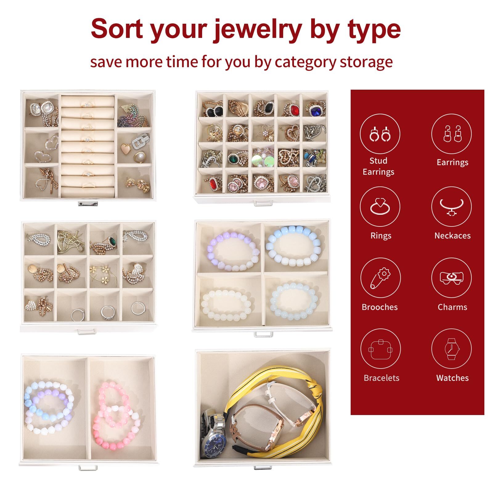 Multi-functional Jewelry Holder Organizer: The first layer on jewelry box with satisfy all your daily makeup needs. It with 6 earrings grids for stud earrings,brooches, Christmas charms. And it has 14 ring lines for ring holder, and 1 big mirror. Long Necklace Organizer: With excellent craftsmanship, this jewelry organizer will surprise you with its superior quality. With 16 necklace hooks on 2 jewelry organizer, you can hanging 16 necklaces in it. Makeup Organizer: The bottom drawer is really a huge drawer for your big stuffs, even for you cosmetics. With 5 drawers and 1 layer, you can take it as your makeup and jewelry box. All your daily storage needs will be take in it. Space and Time Saving for Makeup Table: With our 6 layer jewelry box, all your jewelry will be in good order and easy to reach. From then on, you have a bright dresser that saves space and makes your room look neater and more elegant. In addition, our jewelry travel boxes are designed to categorize your jewelry at a glance, shortening search time. Ideal Jewelry Gift Box : This PU leather jewelry box looks elegant and thoughtful. It is a perfect gifts for yourself, your friends, your wife or your mother for birthdays, Christmas, Valentine's Day, Mother's Day and anniversaries. This jewelry holder can be used not only as a girl's jewelry box, ring storage box, necklace storage box, earrings storage box, but also as a gift box for bracelets.