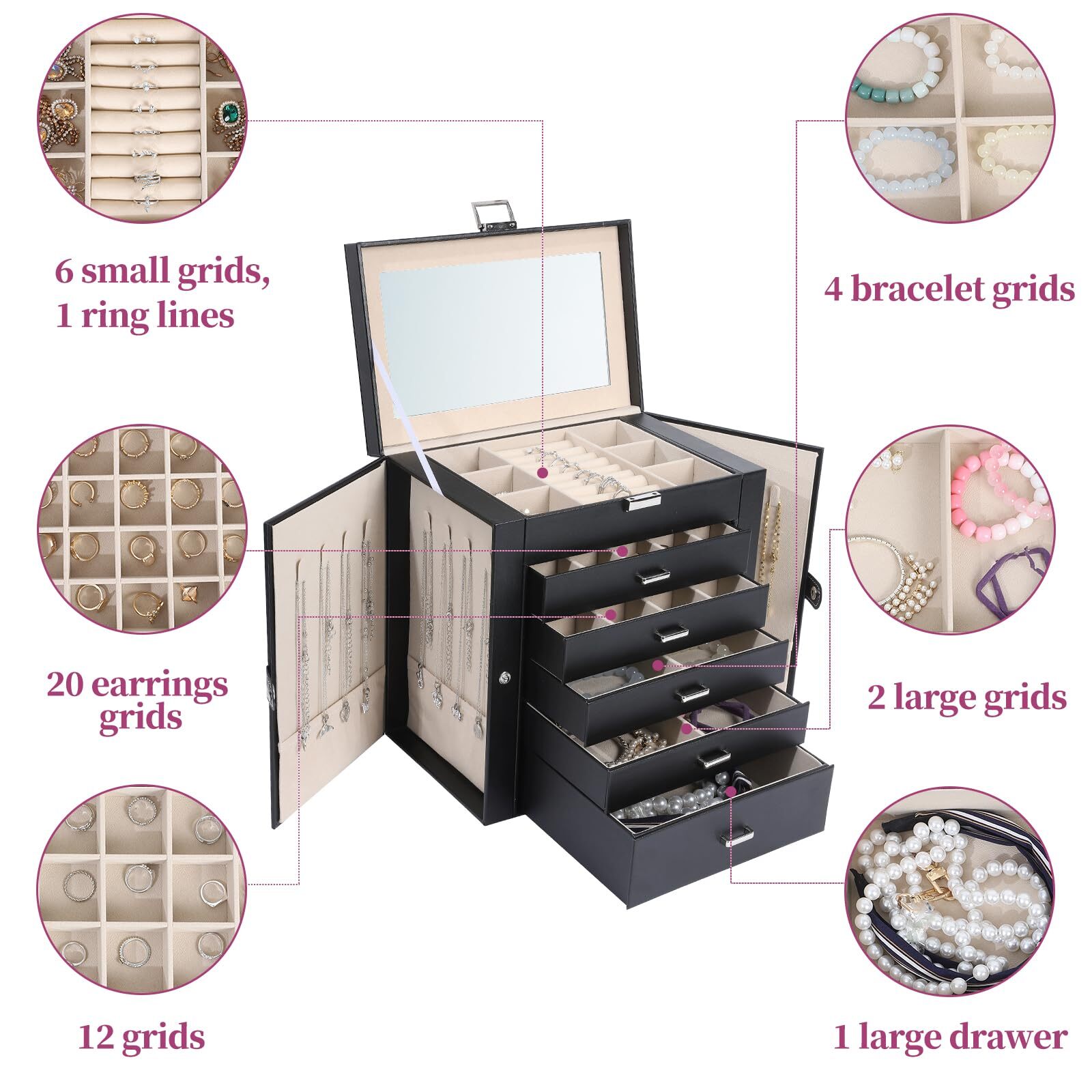 Jewelry Box for Women, 6 Layer Large Jewelry Holder Organizer with 5 Drawers ...