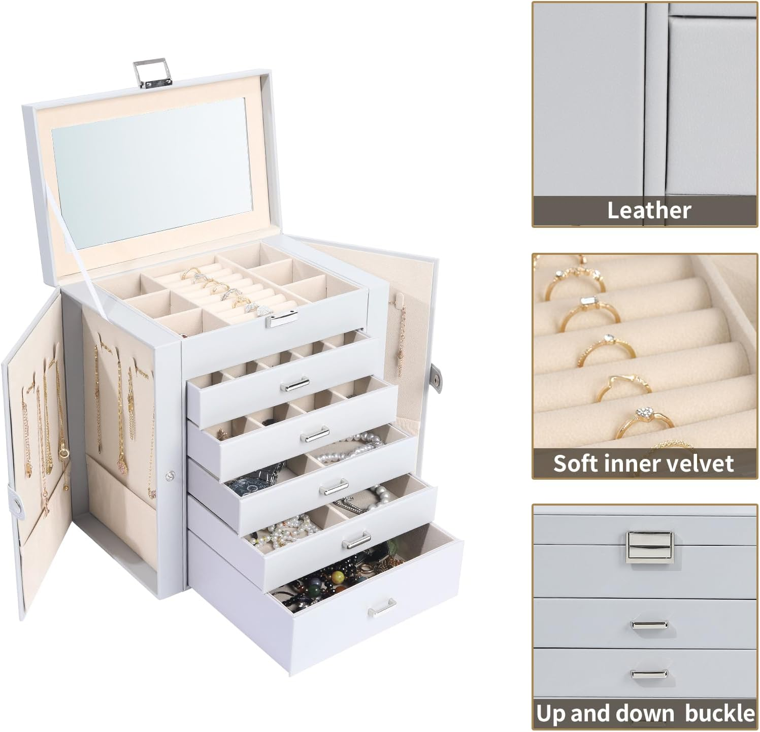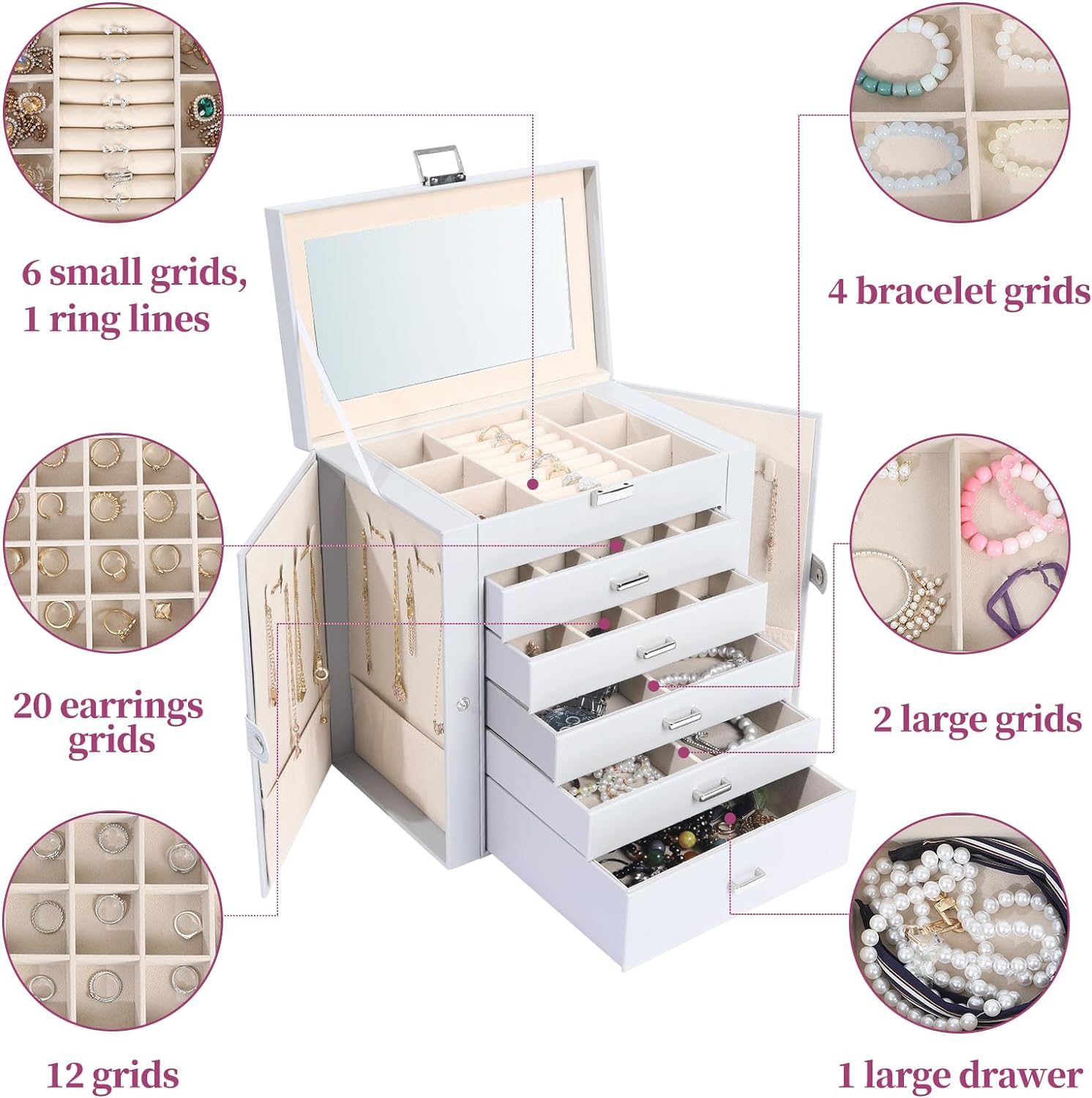 Store New Arrivals Add to Favorite View Feedback Contact Jewelry Box for Women, 6 Layer Lockable Large Jewelry Holder Organizer with 5 Drawers for Jewelry Storage, Big Jewelry Box for Womens’ Christmas Gift (Gray) Description Item model number AG61024JB Style Modern Number of Items 1 Country of Origin China Batteries Included? No Jewelry Storage Type Jewelry Box Batteries Required? No Number of Compartments 4 Special Feature Mirror Product Dimensions 10"D x 8"W x 9"H Material Leather Number of Drawers 5 Finish Type [POSSIBLE] Polished Included Components jewelry box Closure Type Hinge Item Weight 6.41 pounds Finish [POSSIBLE] Polished Occasion Christmas Special Features Mirror Target Audience Women Girl Part Number AG61024JB Mounting Type Table Top Color gray Shape Rectangular Recommended Uses For Product Necklace, Bracelet, Ring, Earring Inner Material Flannelette Multi-functional Jewelry Holder Organizer: The first layer on jewelry box with satisfy all your daily makeup needs. It with 6 earrings grids for stud earrings,brooches, Christmas charms. And it has 14 ring lines for ring holder, and 1 big mirror. Long Necklace Organizer: With excellent craftsmanship, this jewelry organizer will surprise you with its superior quality. With 16 necklace hooks on 2 jewelry organizer, you can hanging 16 necklaces in it. Makeup Organizer: The bottom drawer is really a huge drawer for your big stuffs, even for you cosmetics. With 5 drawers and 1 layer, you can take it as your makeup and jewelry box. All your daily storage needs will be take in it. Space and Time Saving for Makeup Table: With our 6 layer jewelry box, all your jewelry will be in good order and easy to reach. From then on, you have a bright dresser that saves space and makes your room look neater and more elegant. In addition, our jewelry travel boxes are designed to categorize your jewelry at a glance, shortening search time. Ideal Jewelry Gift Box : This PU leather jewelry box looks elegant and thoughtful. It is a perfect gifts for yourself, your friends, your wife or your mother for birthdays, Christmas, Valentine's Day, Mother's Day and anniversaries. This jewelry holder can be used not only as a girl's jewelry box, ring storage box, necklace storage box, earrings storage box, but also as a gift box for bracelets. Product Description ABOUT US We offer the best prices around on high quality products. Our E-store includes media such as books, movies, music and games while offering electronics, toys, sporting apparel, clothing, tools, general home, garden items and more. SHIPPING We are always working hard to ensure your package arrives as soon as possible. Please understand that some factors like weather, high postal traffic, and the performance of shipping companies are outside of our control. We offer free shipping to the lower 48 states and ship within 2 business days of payment, usually sooner. We do not accept P.O. Boxes. Please provide a physical address. For shipping outside of the continental USA, we only use eBay's Global Shipping Program.The item is shipped to KY and then sent to the rest of the world. International customers are responsible for all duties and taxes. Continue to check out in order to calculate costs for shipping the item to your country. Messages regarding eBay's Global Shipping Program MUST be directed at eBay EXCLUSIVELY. RETURNS We offer a 30-Day Return Policy on items which you are not completely satisfied with. You have the option for a full-refund or an exchange of the item. No returns are available on items shipped outside of the USA. PAYMENT We accept PayPal. CONTACT US This page content is yet to come Please ad us to your favorite seller and visit again later Thank You CUSTOMER SATISFACTION We try our very best to make sure every customer is completely satisfied. If there's a problem, message us! We're happy to help.