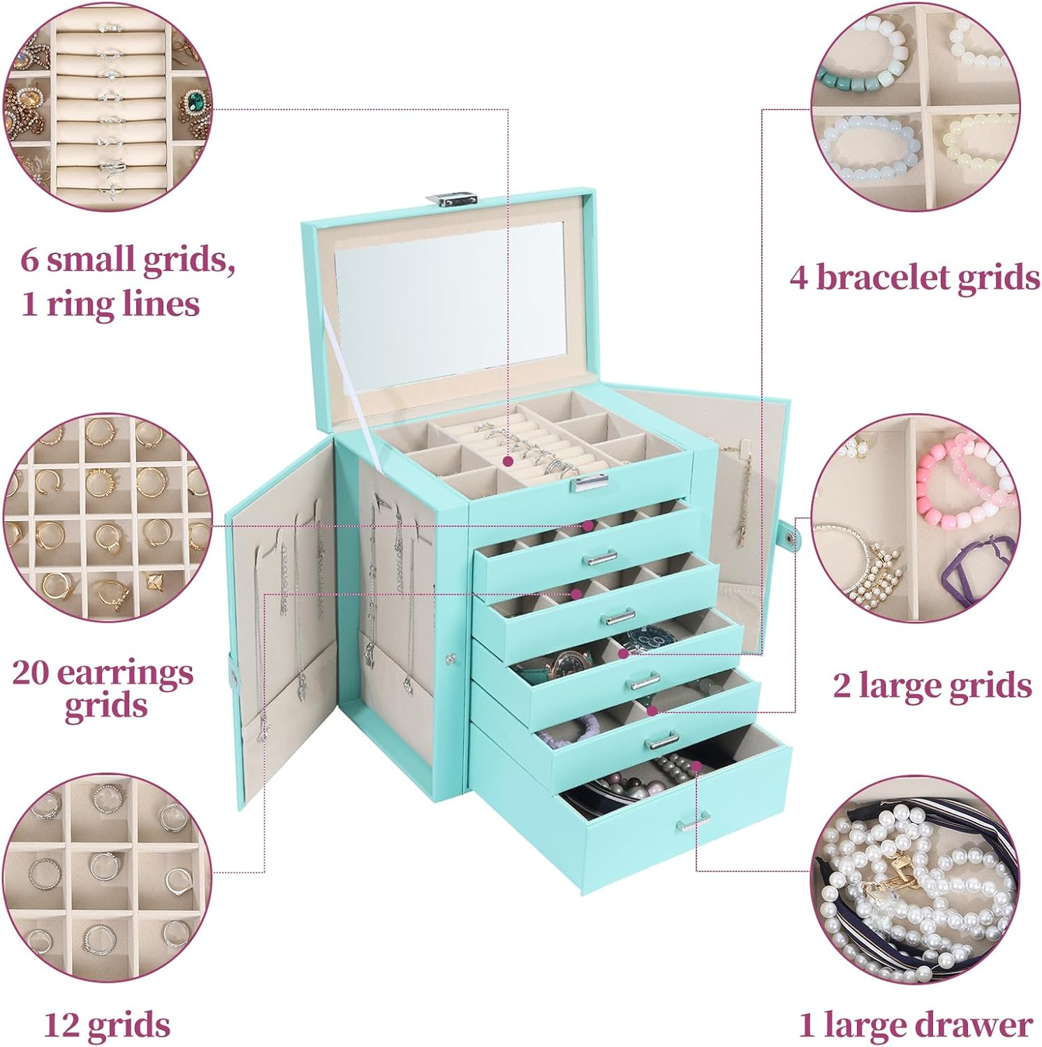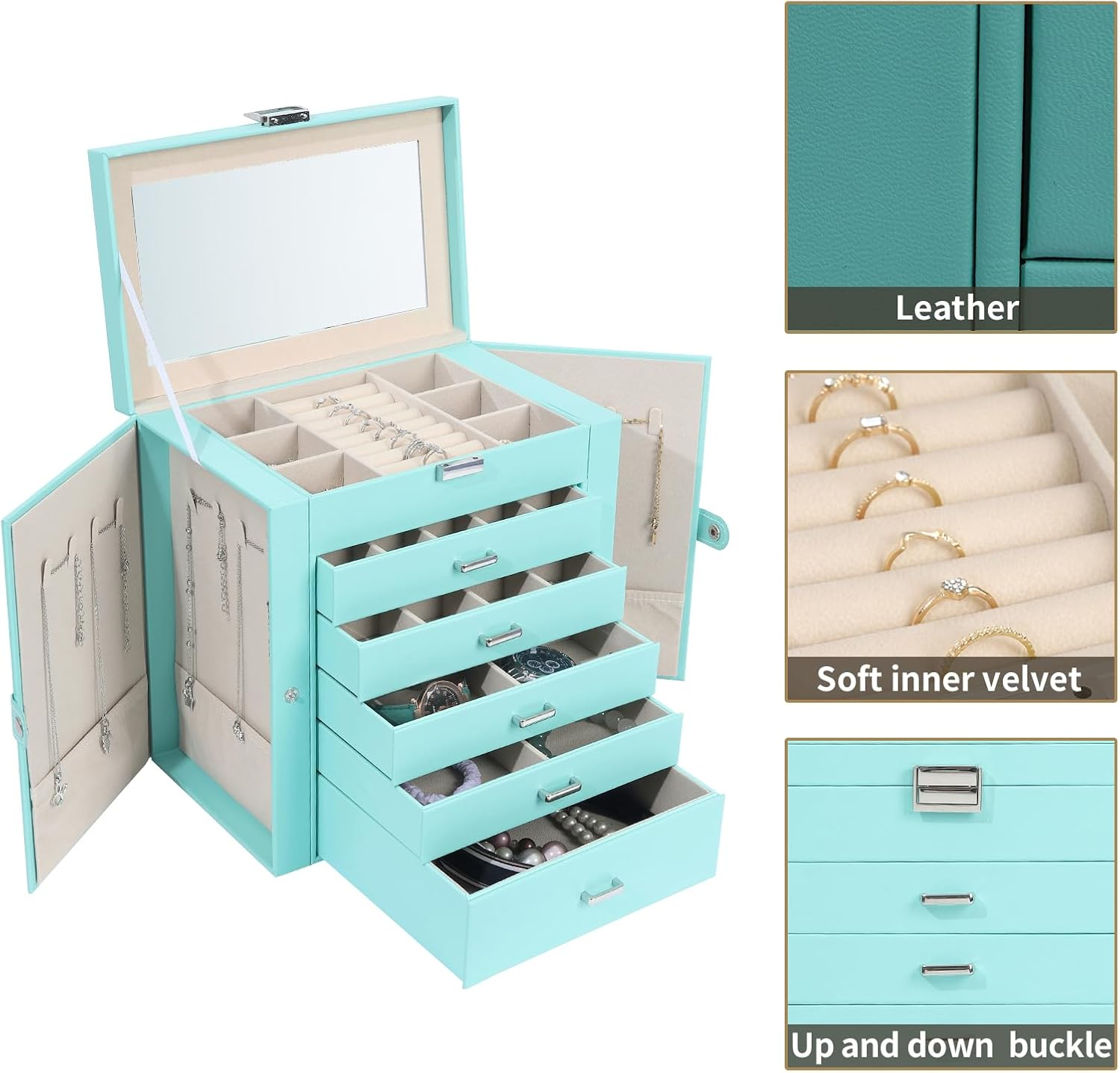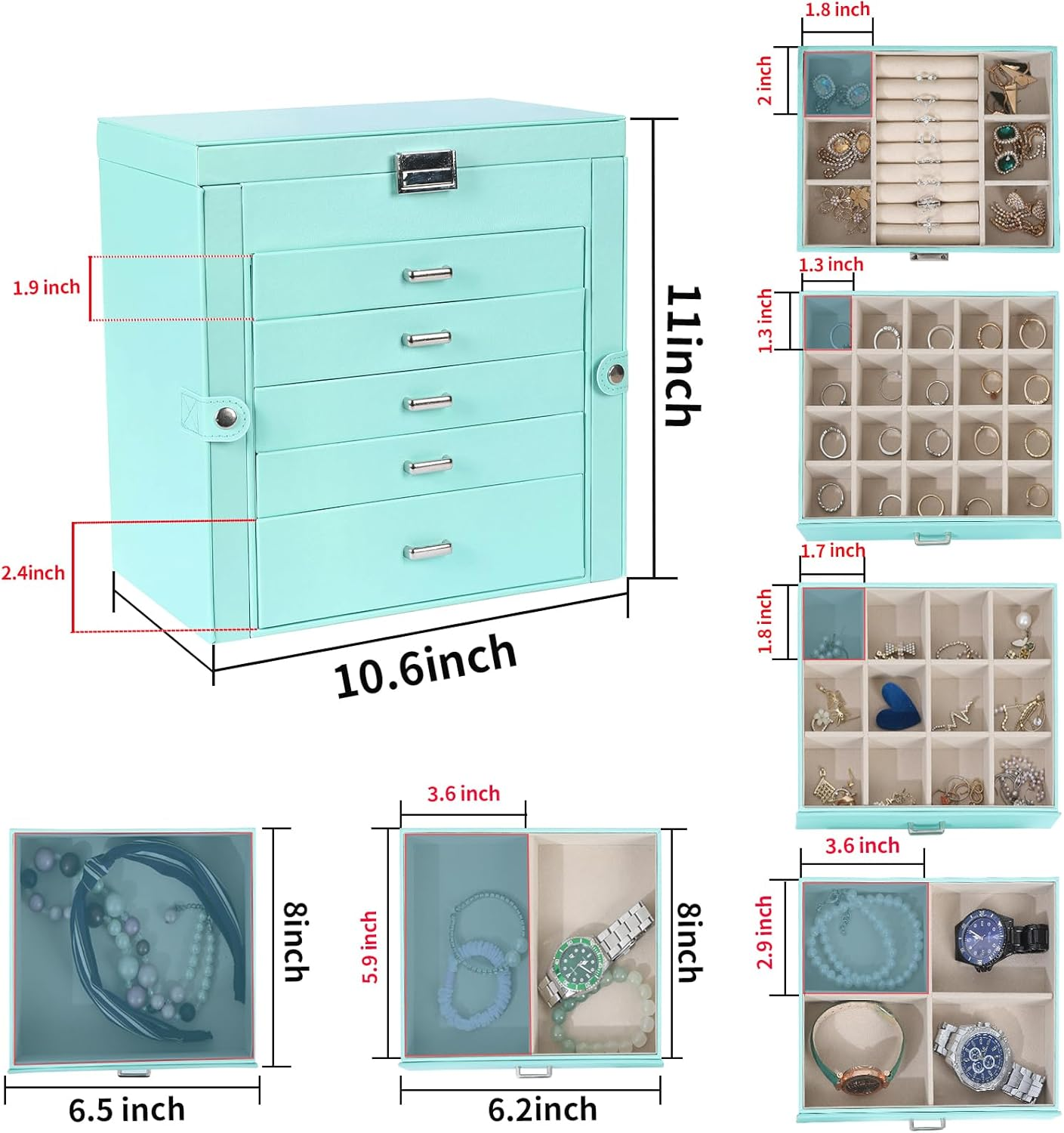 Menu Other Items Feedbacks About Us Contact Us Add To Favorites Jewelry Box for Women, 6 Layer Lockable Large Jewelry Holder Organizer with 5 Drawers for Jewelry Storage, Big Jewelry Box for Womens’ Christmas Gift (Blue) Multi-functional Jewelry Holder Organizer: The first layer on jewelry box with satisfy all your daily makeup needs. It with 6 earrings grids for stud earrings,brooches, Christmas charms. And it has 14 ring lines for ring holder, and 1 big mirror. Long Necklace Organizer: With excellent craftsmanship, this jewelry organizer will surprise you with its superior quality. With 16 necklace hooks on 2 jewelry organizer, you can hanging 16 necklaces in it. Makeup Organizer: The bottom drawer is really a huge drawer for your big stuffs, even for you cosmetics. With 5 drawers and 1 layer, you can take it as your makeup and jewelry box. All your daily storage needs will be take in it. Space and Time Saving for Makeup Table: With our 6 layer jewelry box, all your jewelry will be in good order and easy to reach. From then on, you have a bright dresser that saves space and makes your room look neater and more elegant. In addition, our jewelry travel boxes are designed to categorize your jewelry at a glance, shortening search time. Ideal Jewelry Gift Box : This PU leather jewelry box looks elegant and thoughtful. It is a perfect gifts for yourself, your friends, your wife or your mother for birthdays, Christmas, Valentine's Day, Mother's Day and anniversaries. This jewelry holder can be used not only as a girl's jewelry box, ring storage box, necklace storage box, earrings storage box, but also as a gift box for bracelets. Product Description Item Specification Item model number AG61024JB Style Modern Number of Items 1 Country of Origin China Batteries Included? No Jewelry Storage Type Jewelry Box Batteries Required? No Number of Compartments 4 Special Feature Mirror Product Dimensions 10"D x 8"W x 9"H Material Leather Number of Drawers 5 Included Components key Item Weight 6.07 pounds Occasion Christmas Special Features Mirror Target Audience Women Girl Part Number AG61024JB Mounting Type Table Top Color Blue Shape Rectangular Recommended Uses For Product Necklace, Bracelet, Ring, Earring Inner Material Flannelette Dimensions Shipping Returns Additional Info Product Dimensions: 8.0 "h x 10.0 "h x 9.0 "h. Weight: 6.07 lb Fast shipping is very important for us. Our standard shipping service is FREE. Your order will be shipped within 1-3 business days upon full payment received. Most items are delivered within 3-5 business days, however, please allow 3-10 business days. We are shipping only to USA. We only ship to the confirmed Paypal address. We reserve the right to cancel any order for any reason at any time. We are not responsible for undeliverable addresses. We offer a 30 day return policy from checkout winning date. Your satisfaction is guaranteed! If for any reason you are unhappy with your item, just return it within 30 days for a full refund, minus shipping cost. Please contact us prior to initiating a return so that we can issue you a refund authorization. Items defective upon receipt must be packaged in their retail packaging as if new and returned with a detailed description of the problem. Return shipping fees are not refundable. We reserve the right to decline any returns if the above guidelines are not followed. All of our items, unless otherwise stated, will only run on 120 volts. Please check to make sure your country complies with these specifications. If you have a problem or question regarding your transaction please contact us before leaving any type of feedback. We will work with you to resolve any problem you may have.