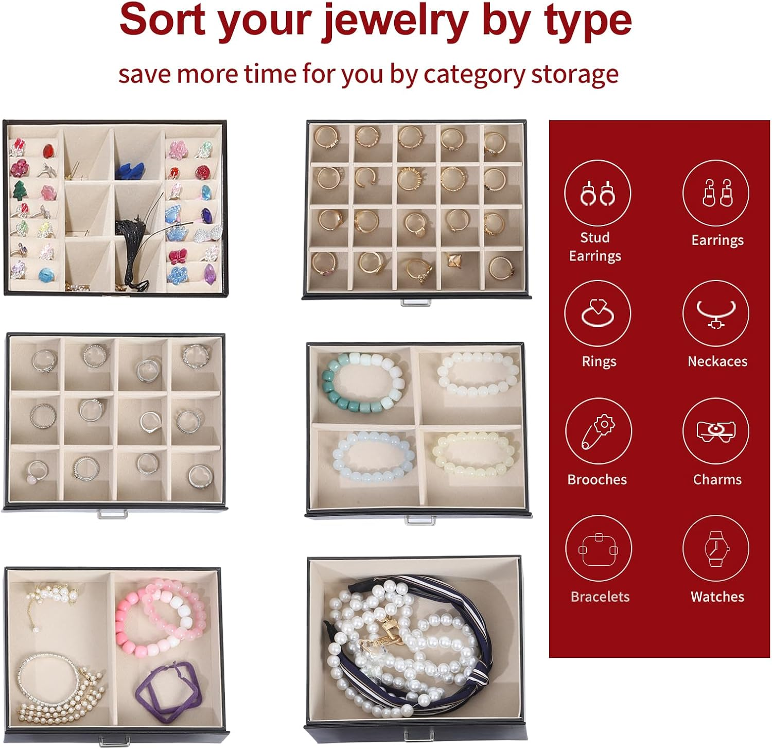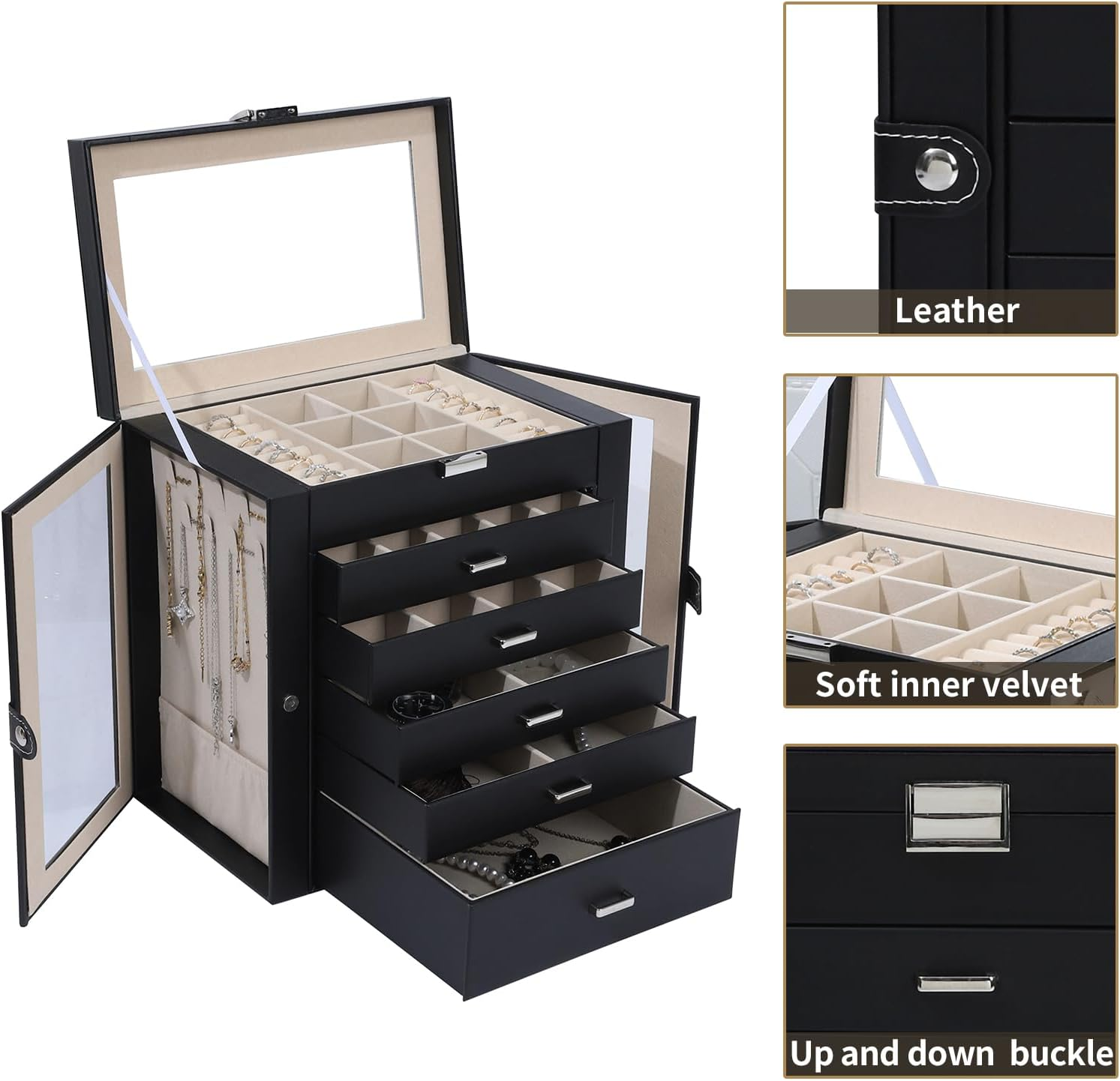 Menu Other Items Feedbacks About Us Contact Us Add To Favorites Jewelry Box for Women, 6 Layer Lockable Large Jewelry Holder Organizer with 5 Drawers for Jewelry Storage, Big Jewelry Box for Womens’ Christmas Gift (Clear Black) Multi-functional Jewelry Holder Organizer: The first layer on jewelry box with satisfy all your daily makeup needs. It with 6 earrings grids for stud earrings,brooches, Christmas charms. And it has 14 ring lines for ring holder, and 1 big mirror. Long Necklace Organizer: With excellent craftsmanship, this jewelry organizer will surprise you with its superior quality. With 16 necklace hooks on 2 jewelry organizer, you can hanging 16 necklaces in it. Makeup Organizer: The bottom drawer is really a huge drawer for your big stuffs, even for you cosmetics. With 5 drawers and 1 layer, you can take it as your makeup and jewelry box. All your daily storage needs will be take in it. Space and Time Saving for Makeup Table: With our 6 layer jewelry box, all your jewelry will be in good order and easy to reach. From then on, you have a bright dresser that saves space and makes your room look neater and more elegant. In addition, our jewelry travel boxes are designed to categorize your jewelry at a glance, shortening search time. Ideal Jewelry Gift Box : This PU leather jewelry box looks elegant and thoughtful. It is a perfect gifts for yourself, your friends, your wife or your mother for birthdays, Christmas, Valentine's Day, Mother's Day and anniversaries. This jewelry holder can be used not only as a girl's jewelry box, ring storage box, necklace storage box, earrings storage box, but also as a gift box for bracelets. Product Description Item Specification Style Modern Mounting Type Table Top Color Clear Black Target Audience Women Girl Item Dimensions D x W x H 10"D x 8"W x 9"H Material Leather Material Type Leather Inner Material Faux Leather Shape Rectangular Style Name Modern Recommended Uses For Product Necklace, Bracelet, Ring, Earring Number of Drawers 5 Jewelry Storage Type Jewelry Box Special Feature Mirror Product Dimensions 10"D x 8"W x 9"H Occasion Christmas Dimensions Shipping Returns Additional Info Product Dimensions: 8.0 "h x 10.0 "h x 9.0 "h. Weight: 6.71 lb Fast shipping is very important for us. Our standard shipping service is FREE. Your order will be shipped within 1-3 business days upon full payment received. Most items are delivered within 3-5 business days, however, please allow 3-10 business days. We are shipping only to USA. We only ship to the confirmed Paypal address. We reserve the right to cancel any order for any reason at any time. We are not responsible for undeliverable addresses. We offer a 30 day return policy from checkout winning date. Your satisfaction is guaranteed! If for any reason you are unhappy with your item, just return it within 30 days for a full refund, minus shipping cost. Please contact us prior to initiating a return so that we can issue you a refund authorization. Items defective upon receipt must be packaged in their retail packaging as if new and returned with a detailed description of the problem. Return shipping fees are not refundable. We reserve the right to decline any returns if the above guidelines are not followed. All of our items, unless otherwise stated, will only run on 120 volts. Please check to make sure your country complies with these specifications. If you have a problem or question regarding your transaction please contact us before leaving any type of feedback. We will work with you to resolve any problem you may have.