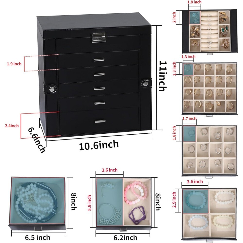 Multi-functional Jewelry Holder Organizer: The first layer on jewelry box with satisfy all your daily makeup needs. It with 6 earrings grids for stud earrings,brooches, Christmas charms. And it has 14 ring lines for ring holder, and 1 big mirror. Long Necklace Organizer: With excellent craftsmanship, this jewelry organizer will surprise you with its superior quality. With 16 necklace hooks on 2 jewelry organizer, you can hanging 16 necklaces in it. Makeup Organizer: The bottom drawer is really a huge drawer for your big stuffs, even for you cosmetics. With 5 drawers and 1 layer, you can take it as your makeup and jewelry box. All your daily storage needs will be take in it.